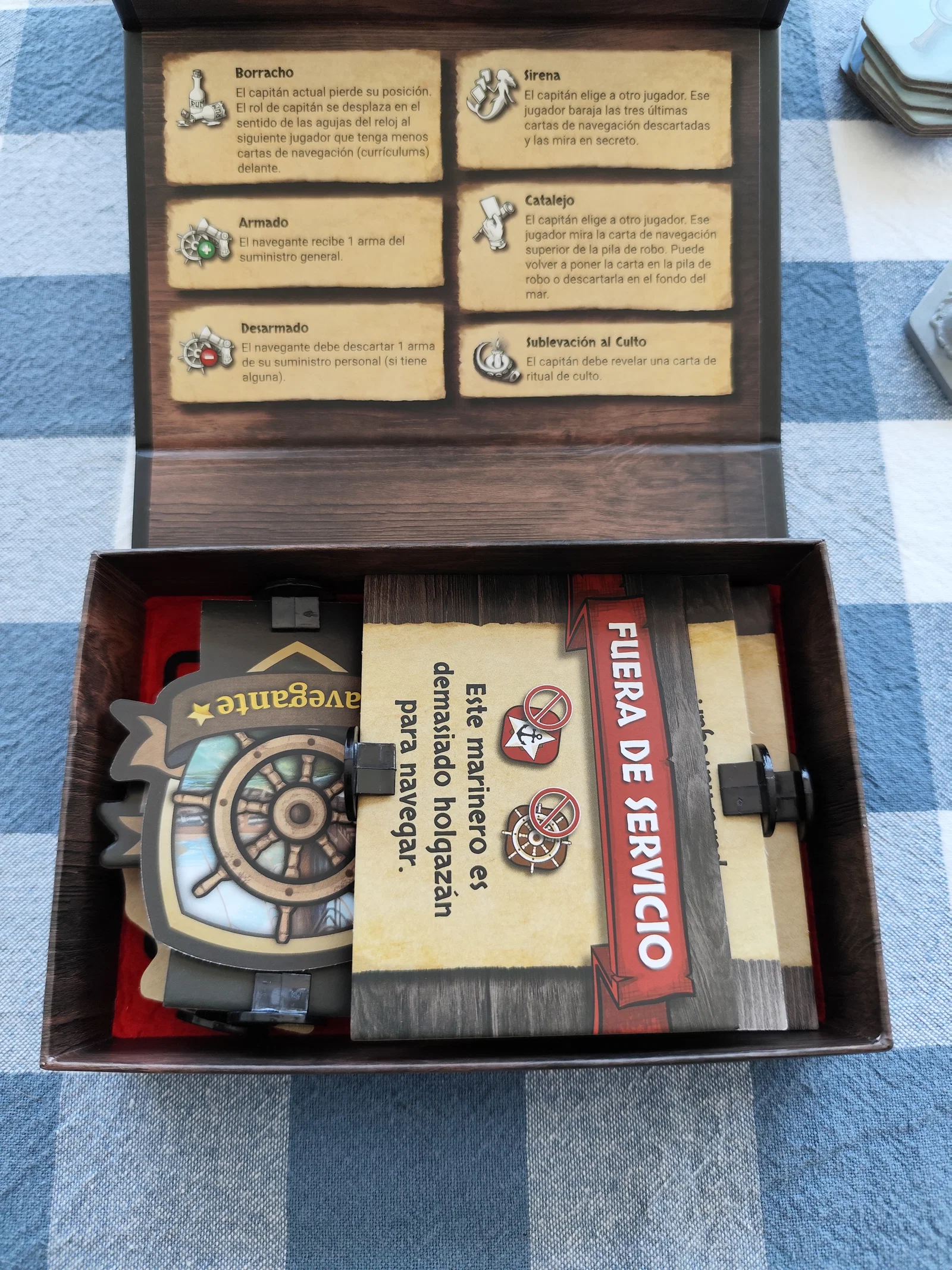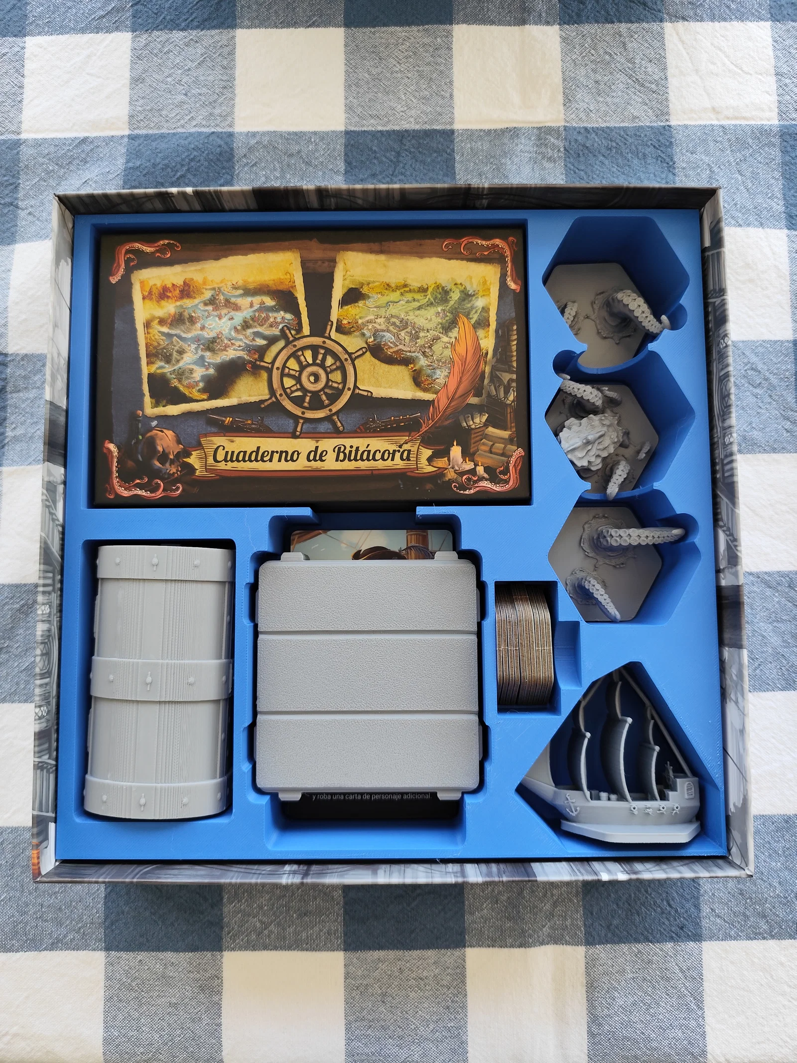 Vũ khí sẽ để trong rương kho báu, tất cả figurine đều có chỗ riêng, và toàn bộ các thành phần dạng cardstock sẽ vừa trong Captain's Logbook.