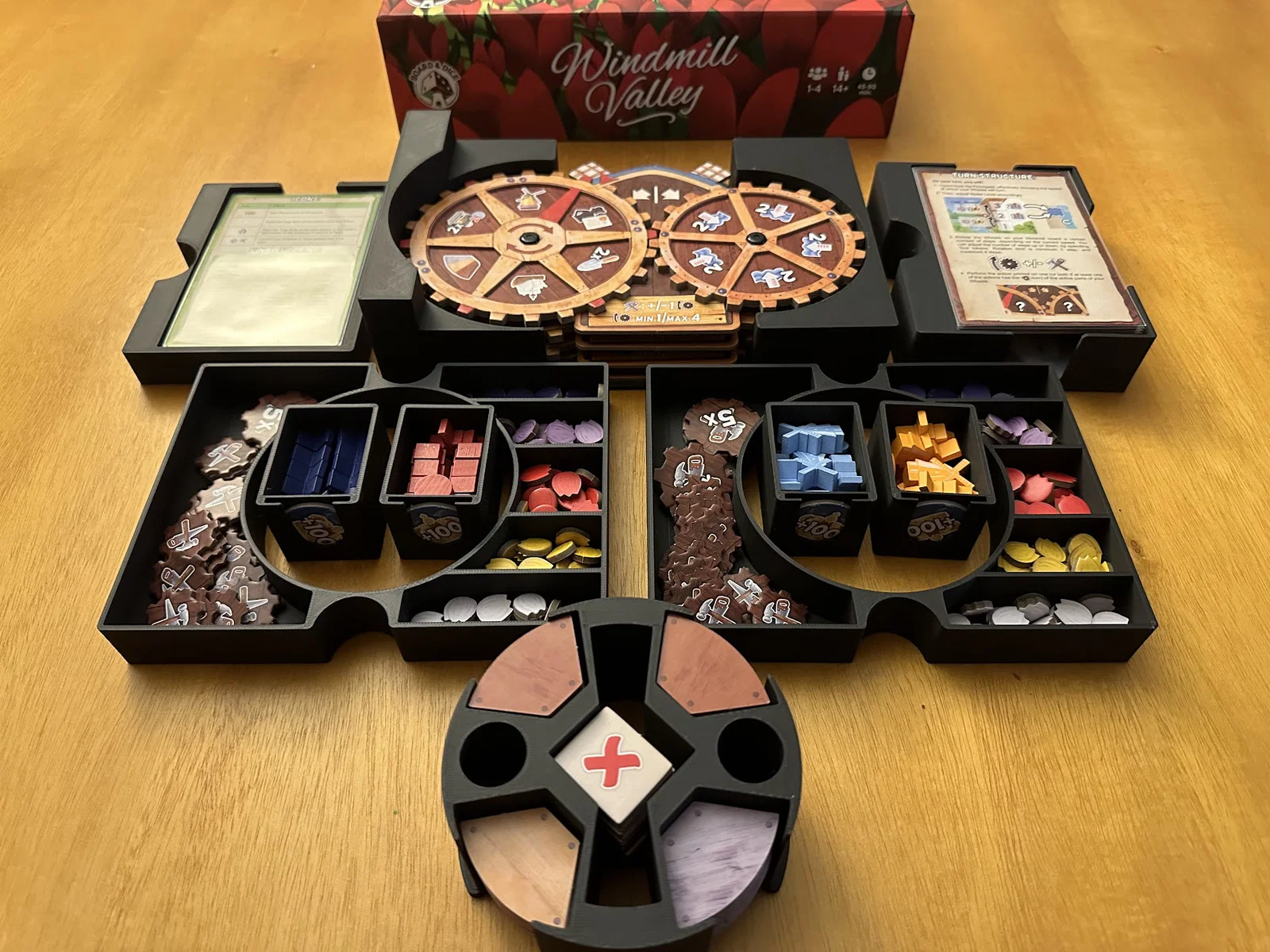 Insert cho Board & Dice Windmill Valley, gồm nhiều khay giúp setup/teardown nhanh, có khay solo và chỗ cho promo enhancement. Hỗ trợ sleeves, lưu trữ dọc; khay tài nguyên trượt vào enhancement wheel.