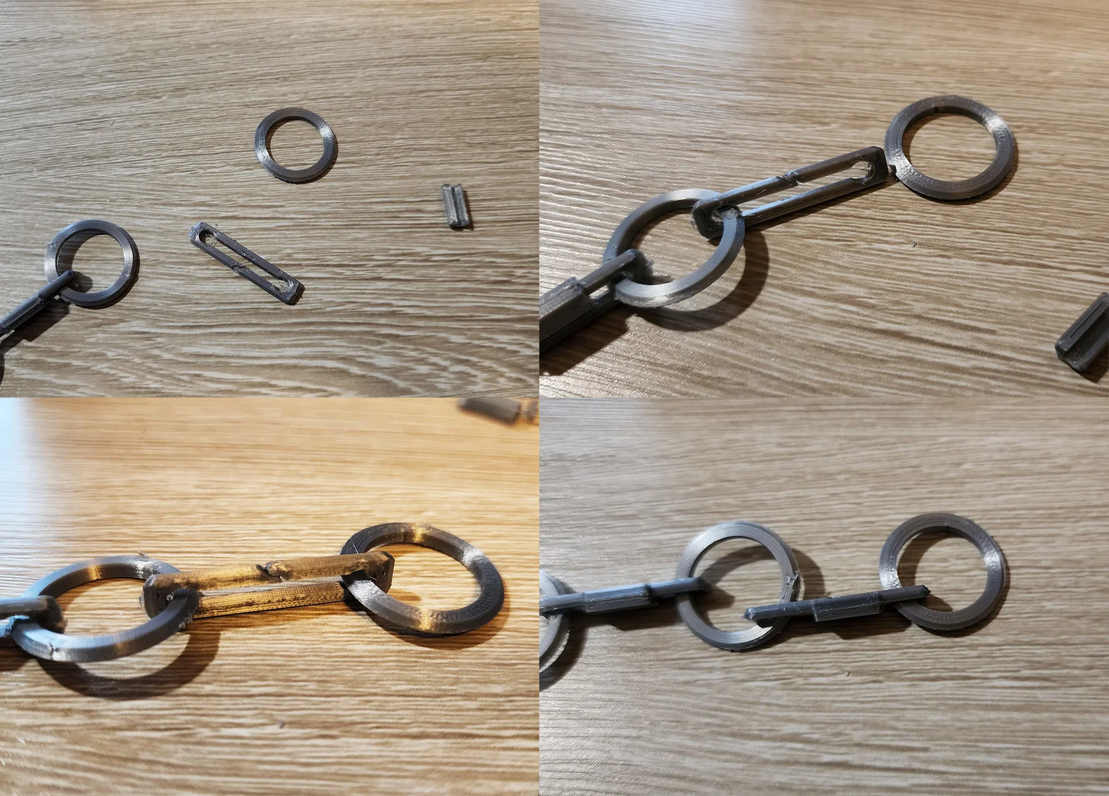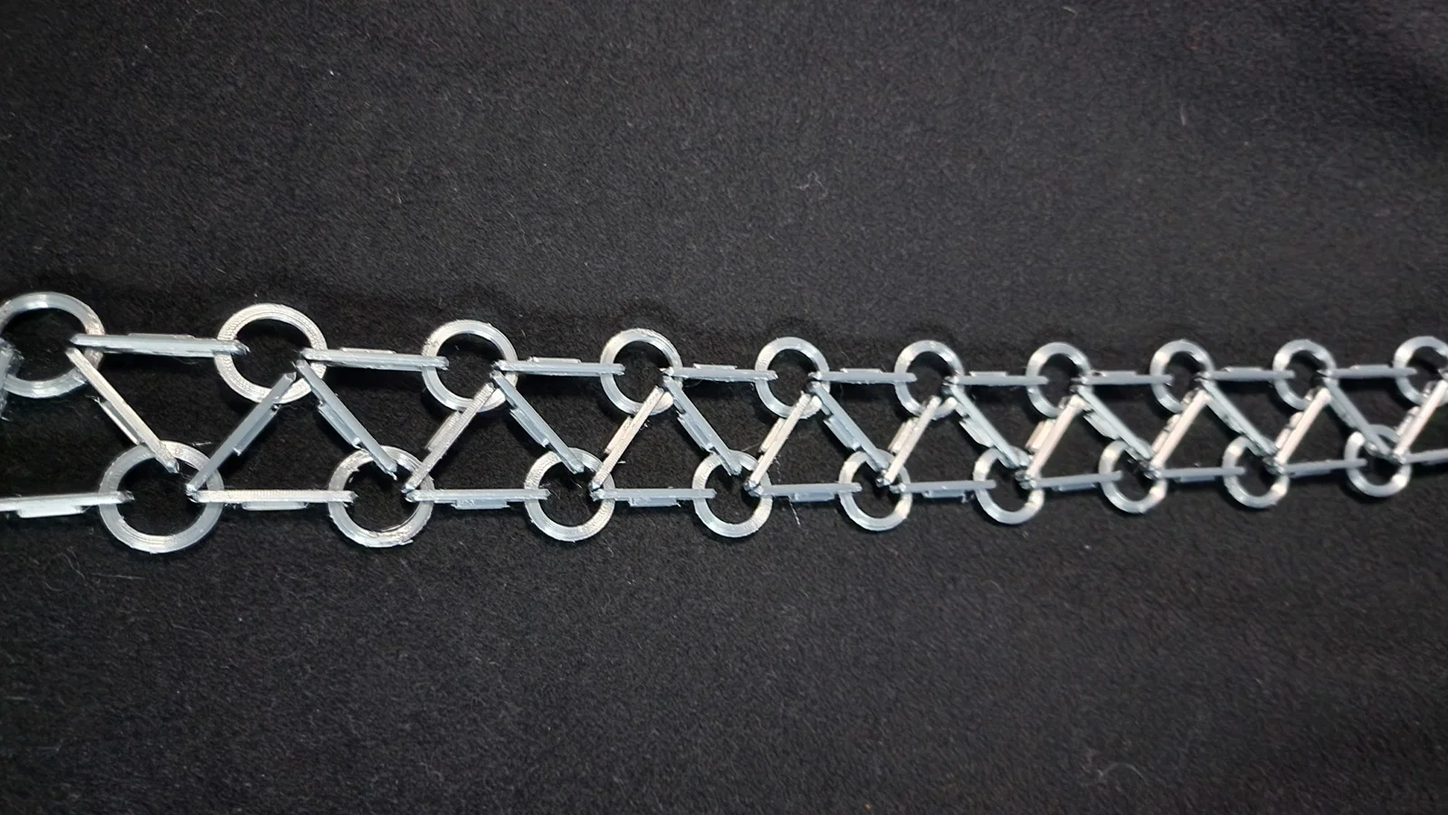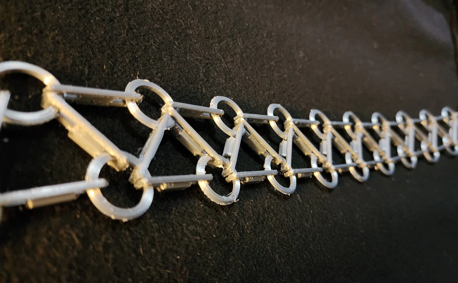 Các links có phần chồng dạng chữ Z, khi khóa bằng clip thì một mắt nối chịu được hơn 15lbs (video bên dưới). Đây là chìa khóa cho độ bền cực cao. Trong hình và video, bạn sẽ thấy mắt nối bị biến dạng dữ dội trước khi nó bung ra. (dày 2.2mm, layer .10mm, Prusament PLA My Silverness).