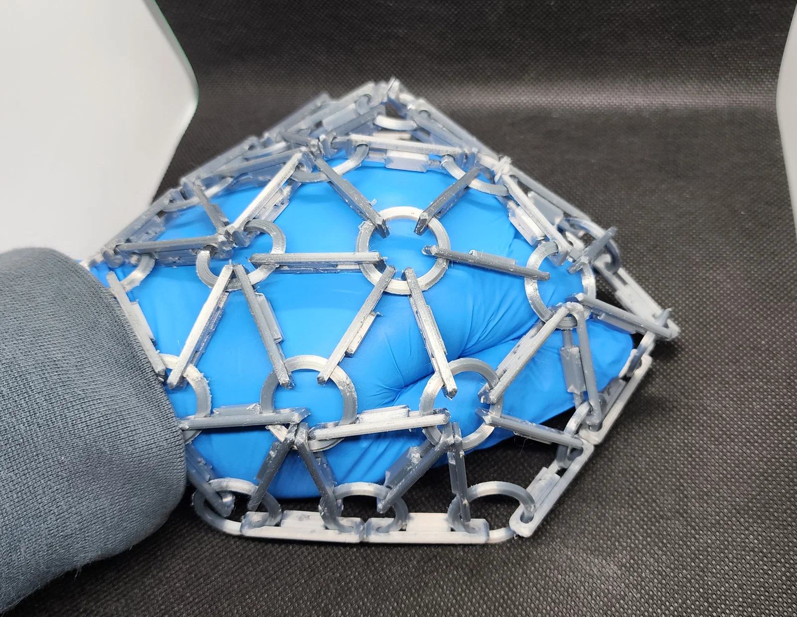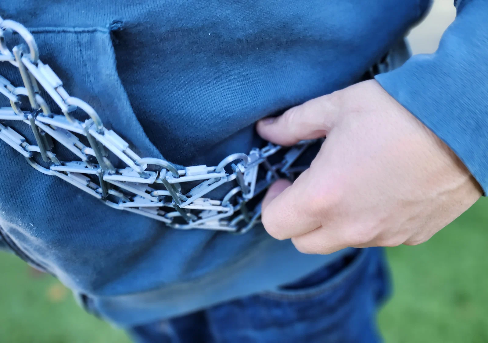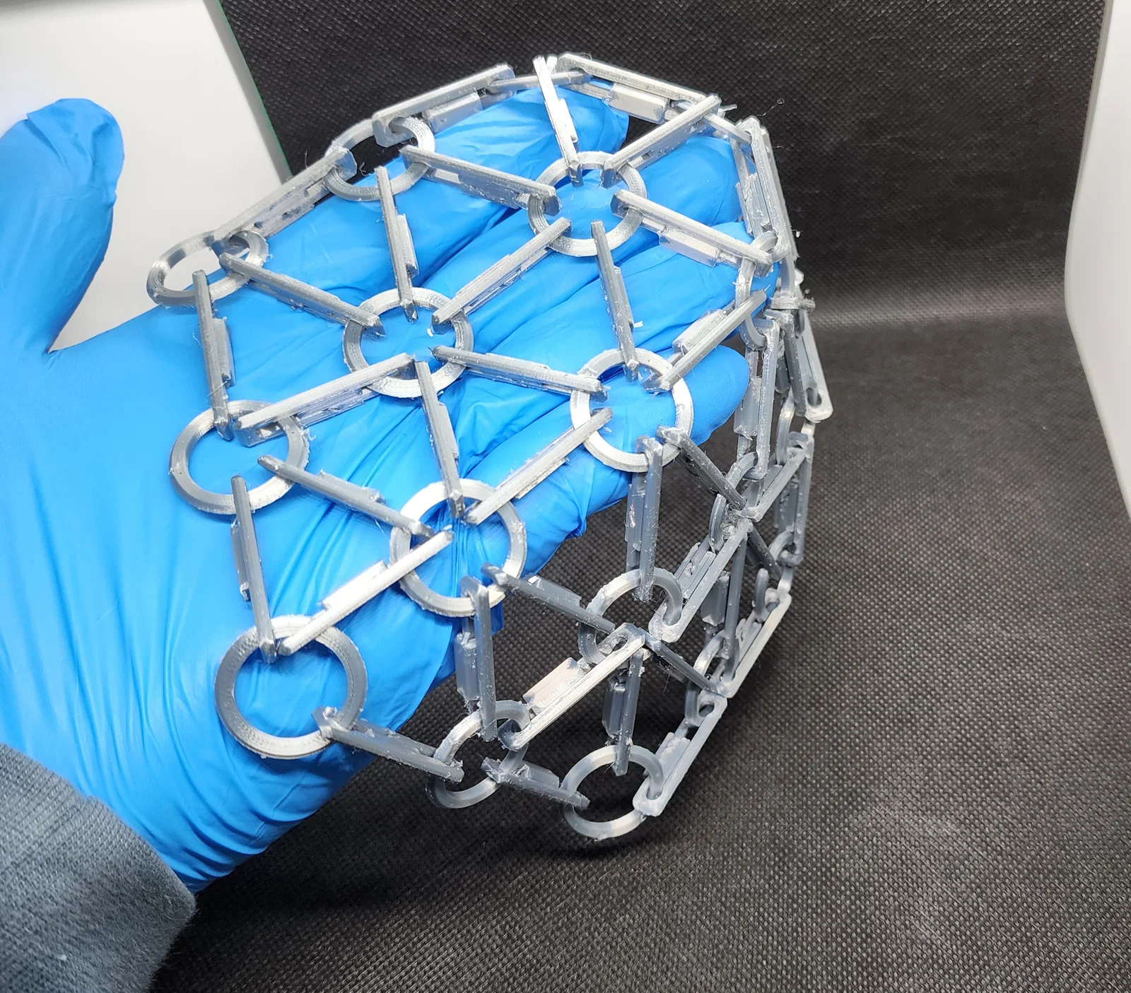 Các links có phần chồng dạng chữ Z, khi khóa bằng clip thì một mắt nối chịu được hơn 15lbs (video bên dưới). Đây là chìa khóa cho độ bền cực cao. Trong hình và video, bạn sẽ thấy mắt nối bị biến dạng dữ dội trước khi nó bung ra. (dày 2.2mm, layer .10mm, Prusament PLA My Silverness).