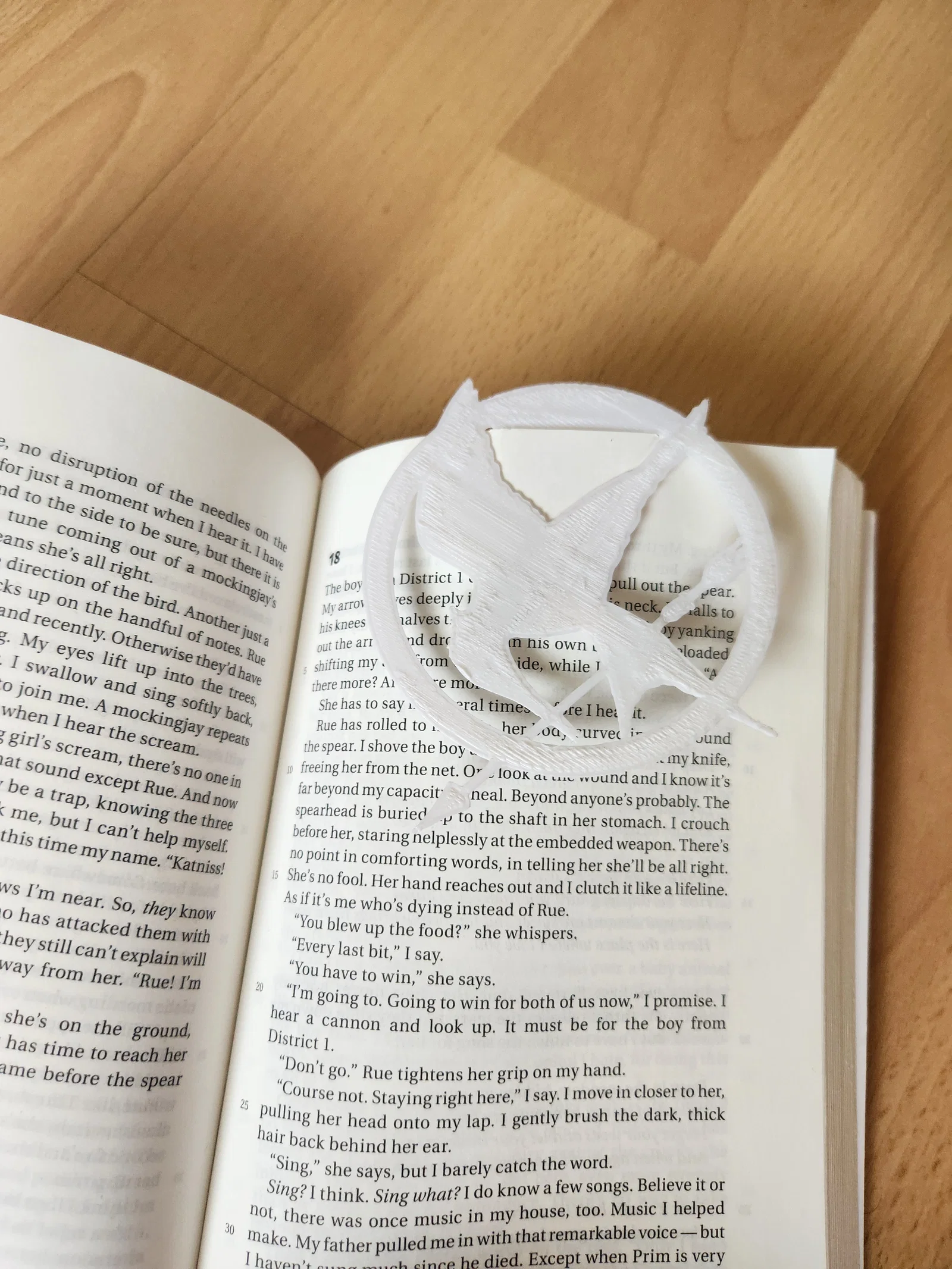 Bookmark hình mockingjay trong Hunger Games, có clip kẹp ở phía trên để gắn vào trang. In khá dễ; nếu viền khó bám bed thì dùng raft rồi cạo bỏ. Nên kẹp vào vài trang để tránh cấn rách giấy.