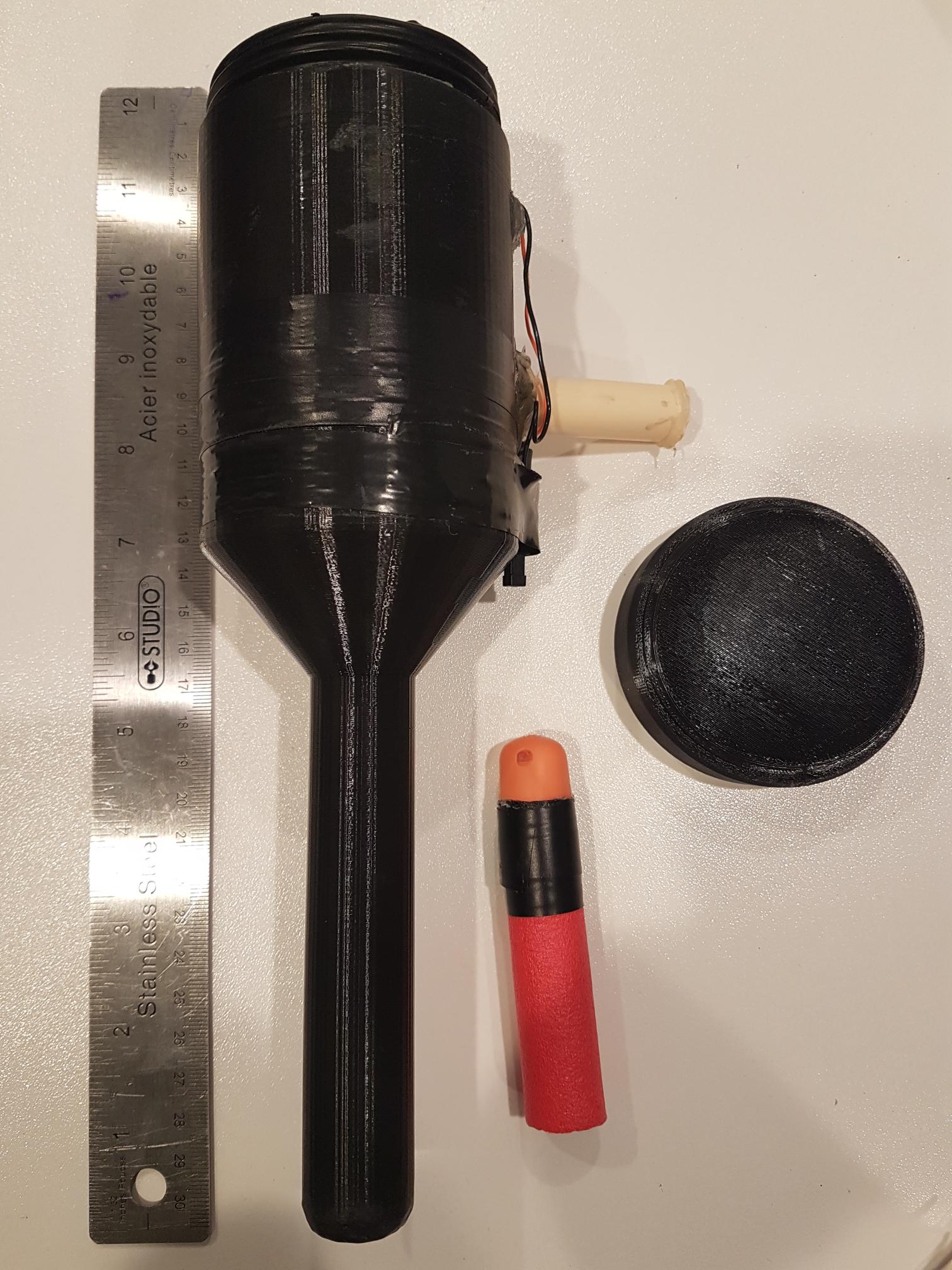 Mini Potato Cannon gồm 3 phần vặn ren. Cần bộ igniter từ bật lửa BBQ và vật bất kỳ vừa nòng (như Nerf Mega dart hoặc bóng Nerf Rival). In PLA+ với 80% infill, không cần supports.
