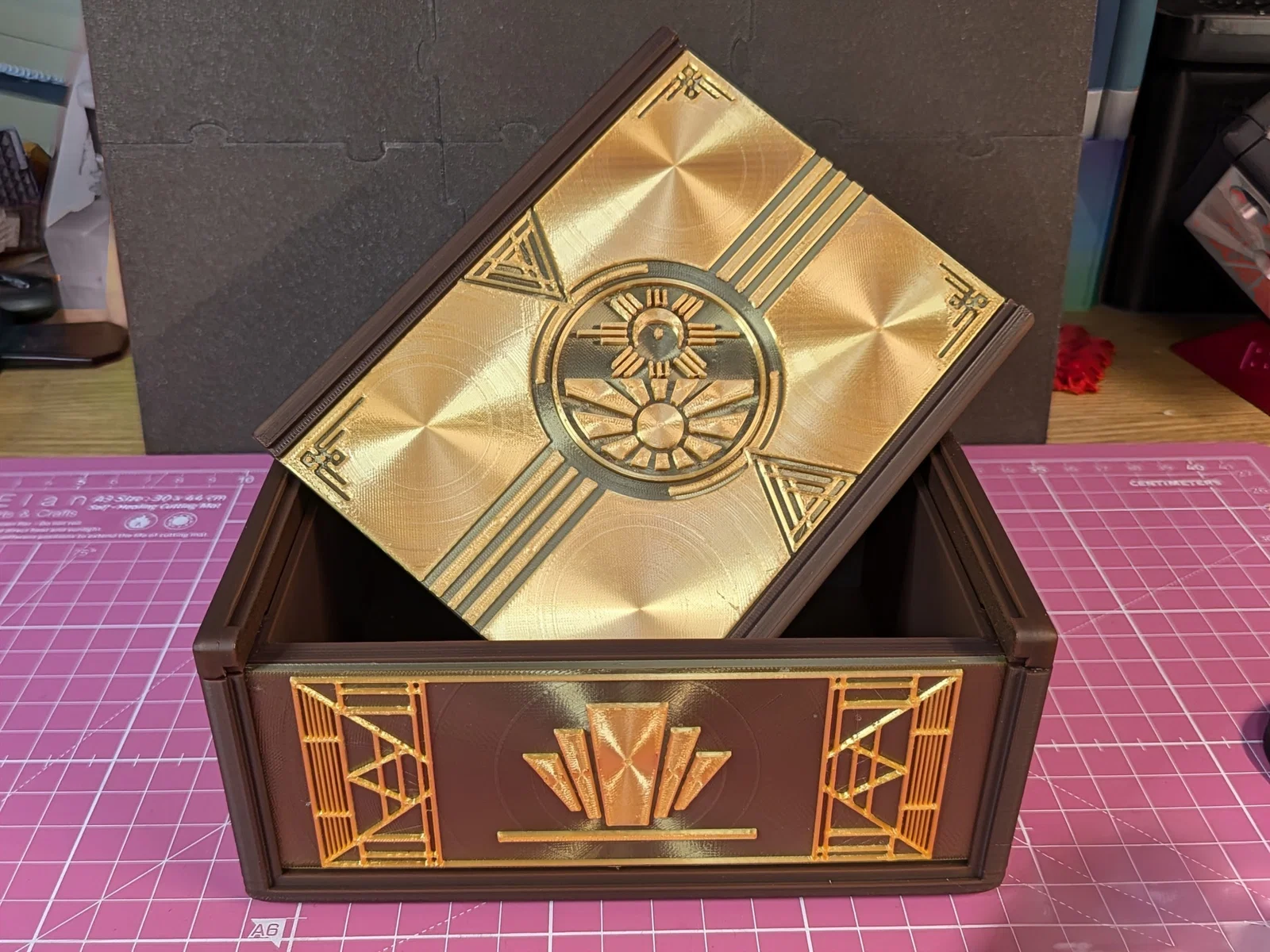 Hộp khóa kiểu Art Deco với các tấm panel tuỳ biến. Mở/đóng bằng cách xoay dial ở giữa để nhả khóa nắp. Có sẵn tuỳ chọn panel và dial, hỗ trợ phối màu đa dạng khi in 3D.