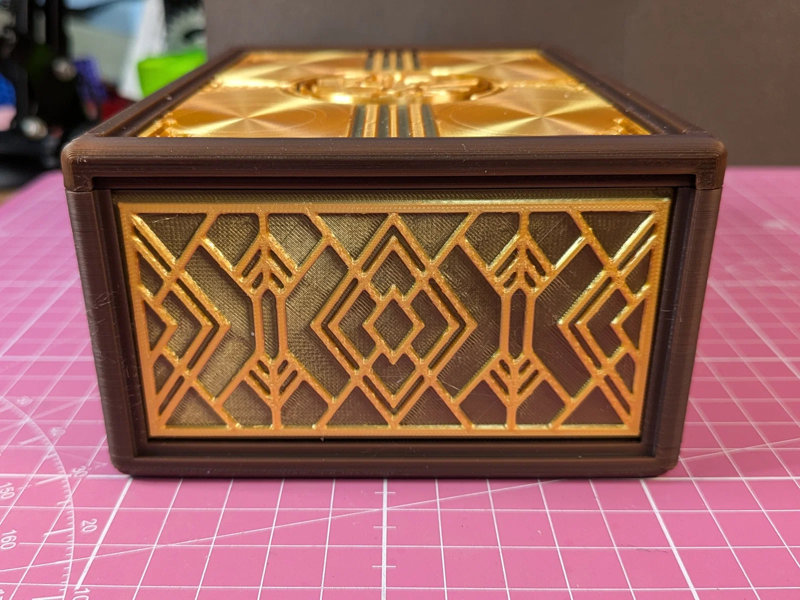 Mình dùng Amazon Basic Silk Gold PLA và CC3D Silk Antique Gold PLA (Panels và Dial), CC3D Chocolate Brown PLA (Base, Side Frame, Upper Lid) và Jayo Wood PLA+ (Lower Lid, Gear, Sliders). Bạn chọn phối màu theo ý thích nha!