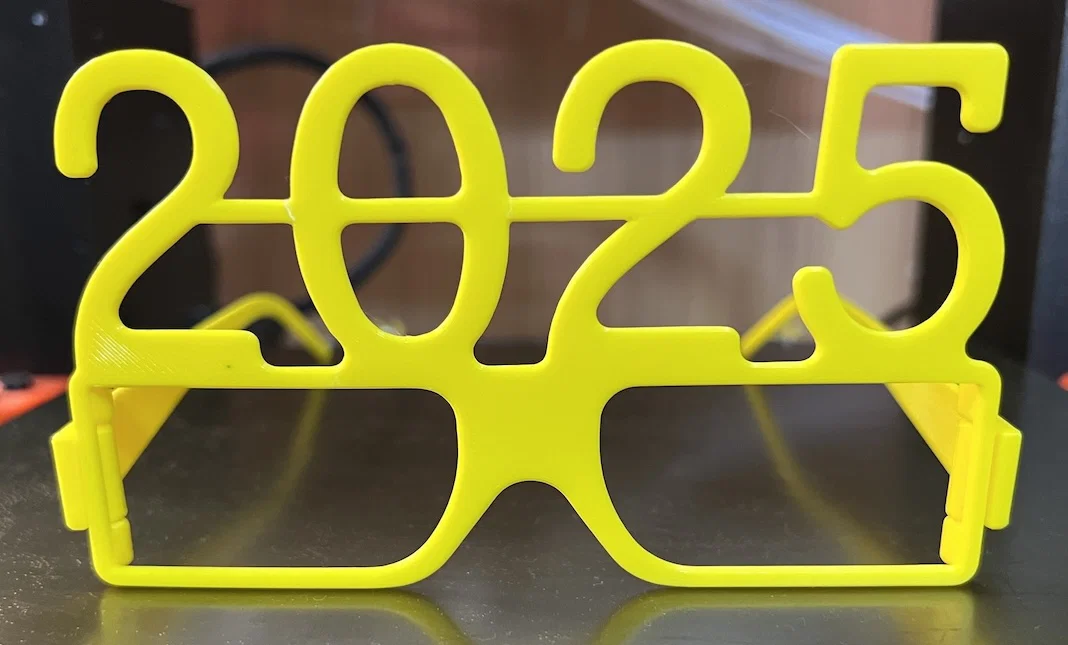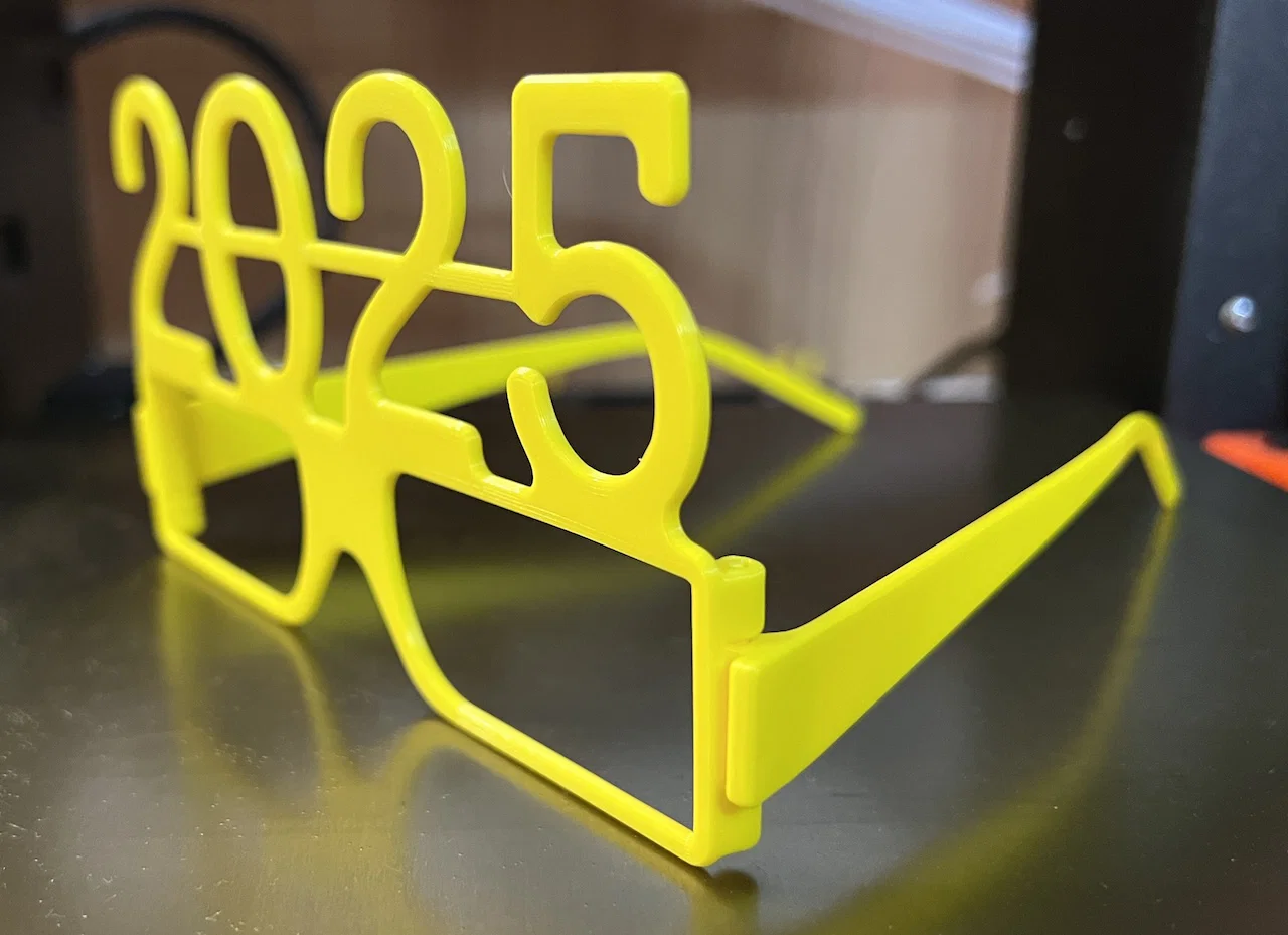 Kính NYE 2025 in nhanh, mọi chi tiết đều in phẳng và không cần support. Dùng đoạn filament 1.75mm làm bản lề, có thể chấm thêm superglue để giữ chắc. Kính gập gọn, dễ mang theo và bỏ túi.