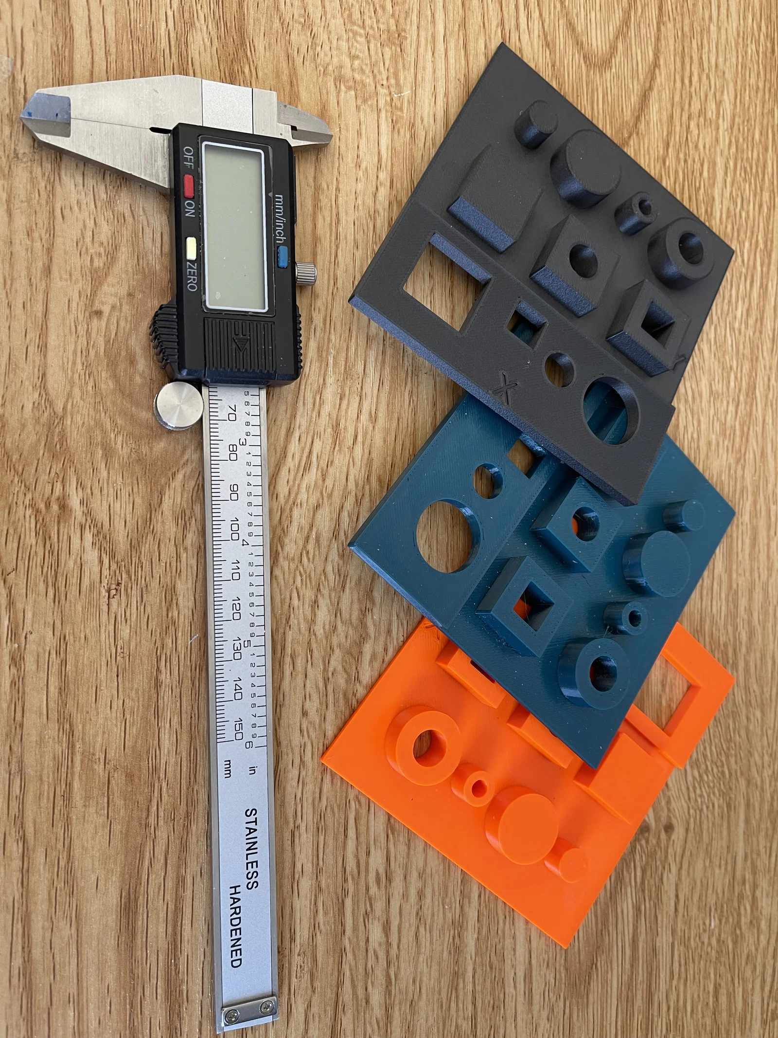 Đánh giá kết quả: Đo mọi kích thước trên mẫu in bằng thước kẹp (Calipers) có màn hình 4 chữ số, và ghi vào spreadsheet. Việc này giúp tính phần trăm sai số và giá trị hiệu chỉnh dễ hơn, ít gõ nhầm hơn. Bạn có thể copy/paste bảng dưới đây vào spreadsheet để tiết kiệm thời gian.