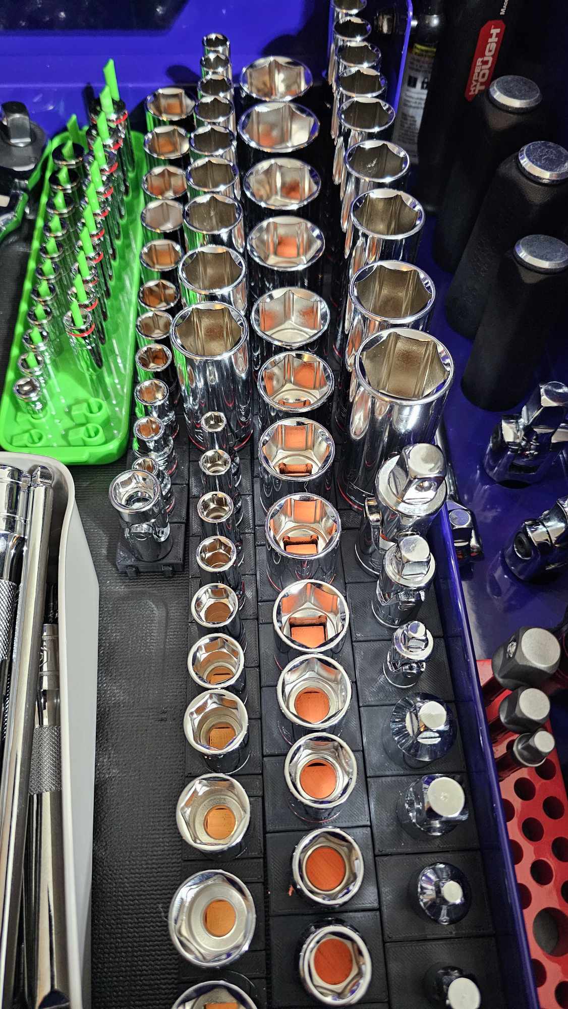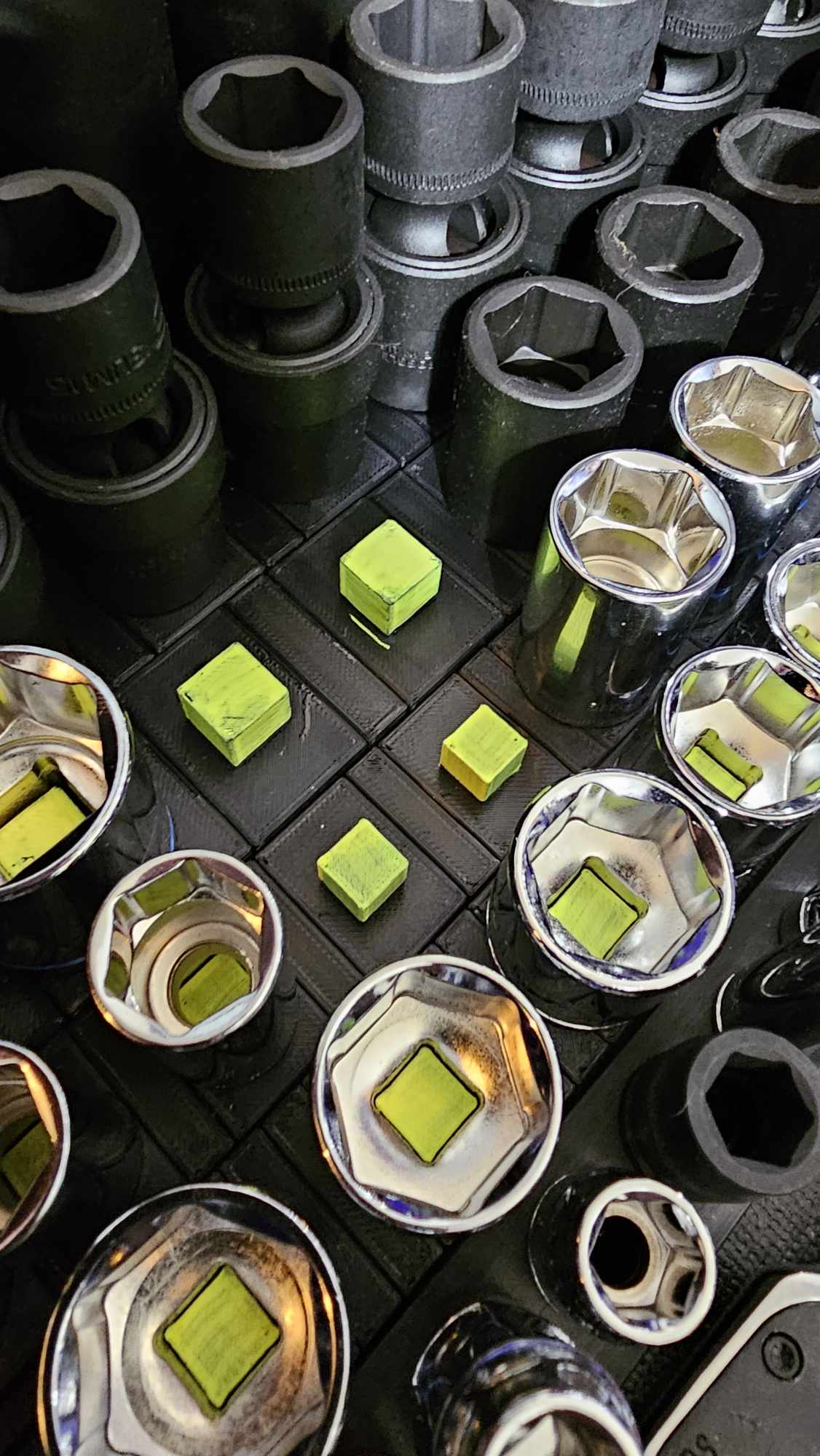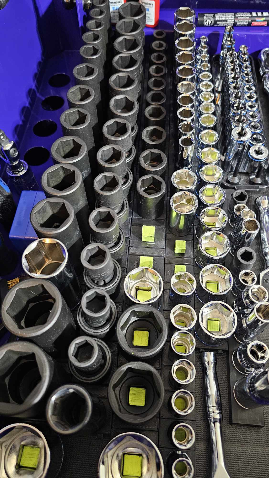 Khay giữ đầu tuýp (socket holder) dạng module cho chuẩn 3/8 và 1/4, thiết kế giống hàng bán sẵn nhưng in 3D tiết kiệm hơn. Gợi ý in peg màu nổi, PLA 15% infill, gắn nam châm 10x2mm hoặc 15x3mm để bám chắc.