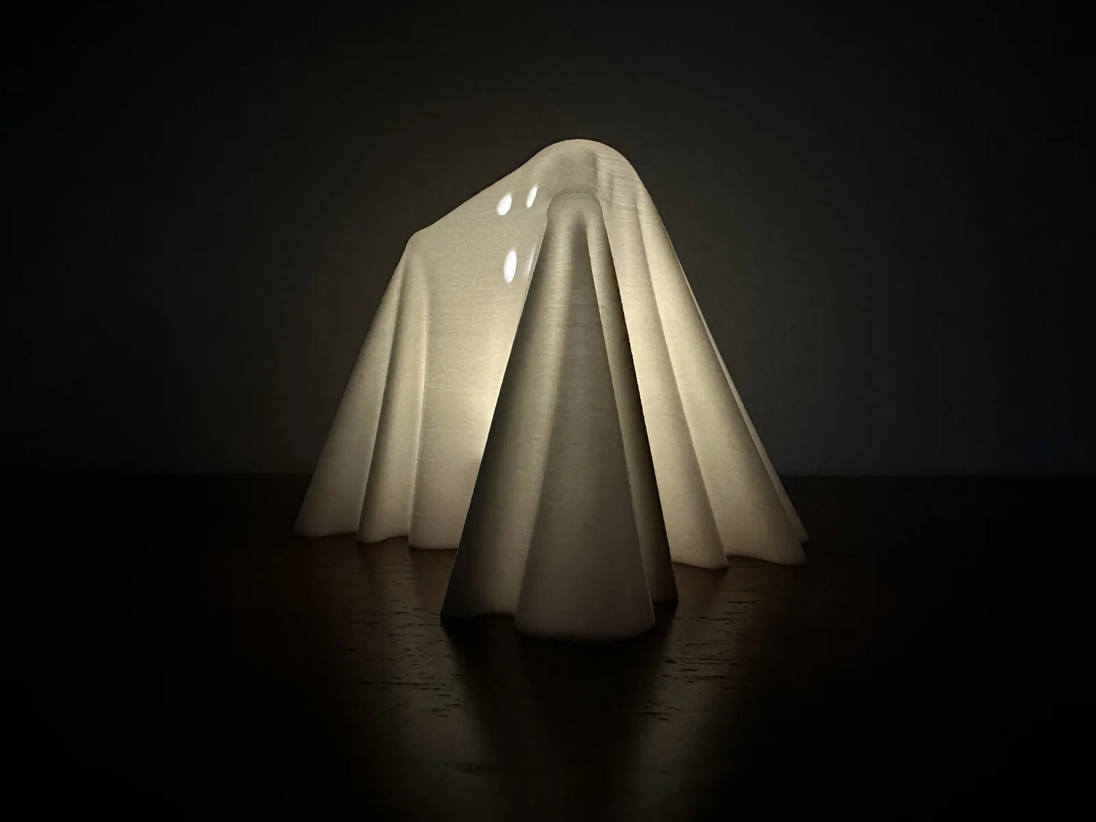 Mô hình Halloween Ghost tạo từ mô phỏng cloth trong Blender, thích hợp trang trí Halloween. Bên trong rỗng để đặt đèn tea light điện. Chỉ dùng nến điện (giả), tuyệt đối không dùng nến lửa thật.