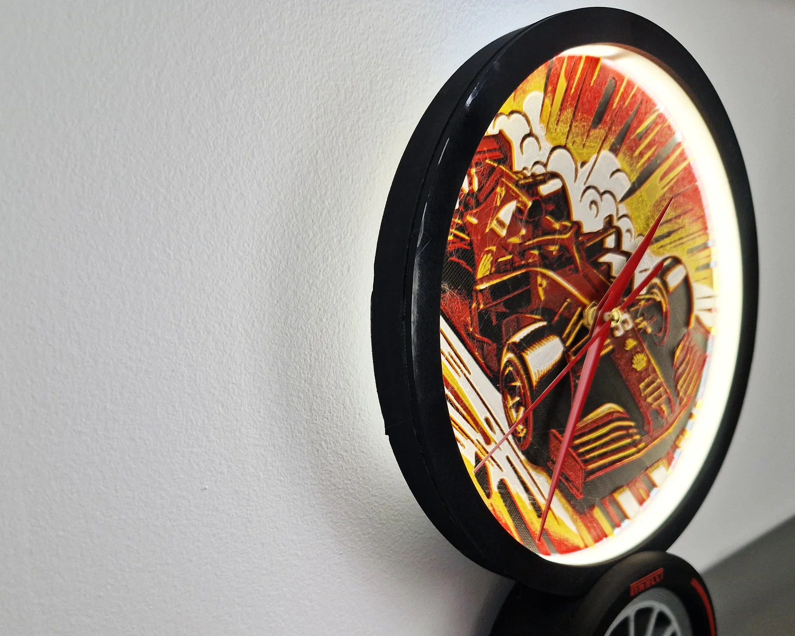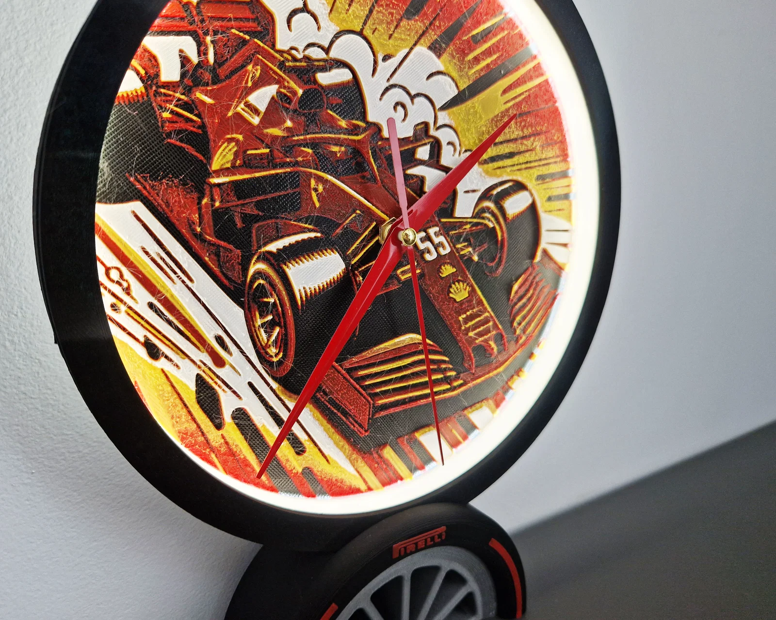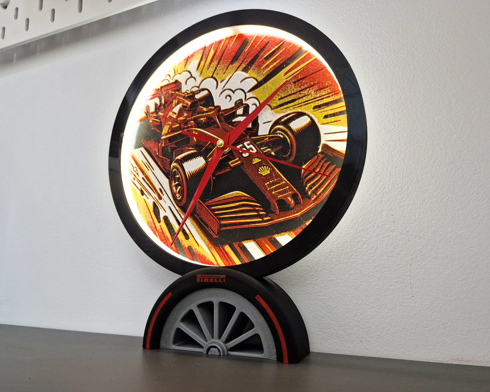 Mẫu đồng hồ Formula 1 đa sắc kiểu Hueforge, chiếu sáng LED cả trước và sau. Có sẵn STL để in và file ảnh đã canh chỉnh để bạn tự tô màu; hỗ trợ đổi màu diffuser bằng M600/M25 hoặc hệ multicolor.