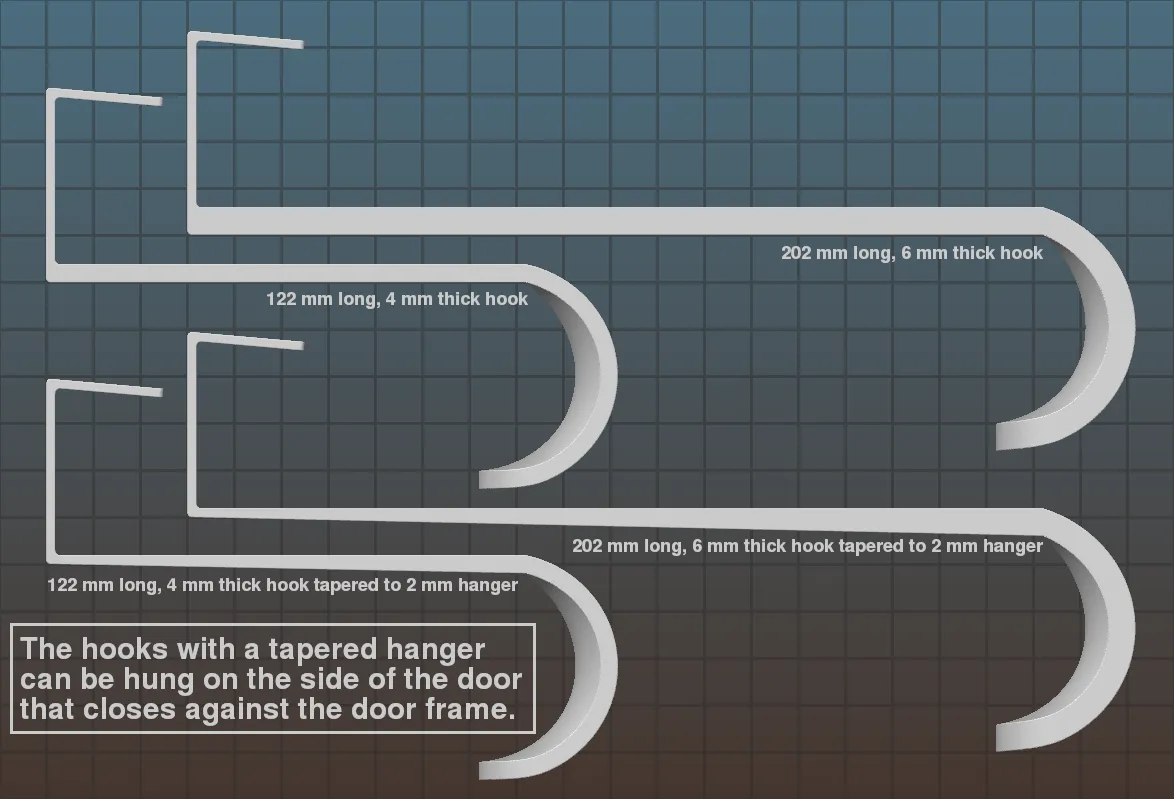 Đây là những móc treo qua cửa có thể được treo trên một cánh cửa tiêu chuẩn 35 mm. Móc có đường cong thẩm mỹ dễ nhìn, giúp tăng khả năng chịu tải so với móc không có đường cong.