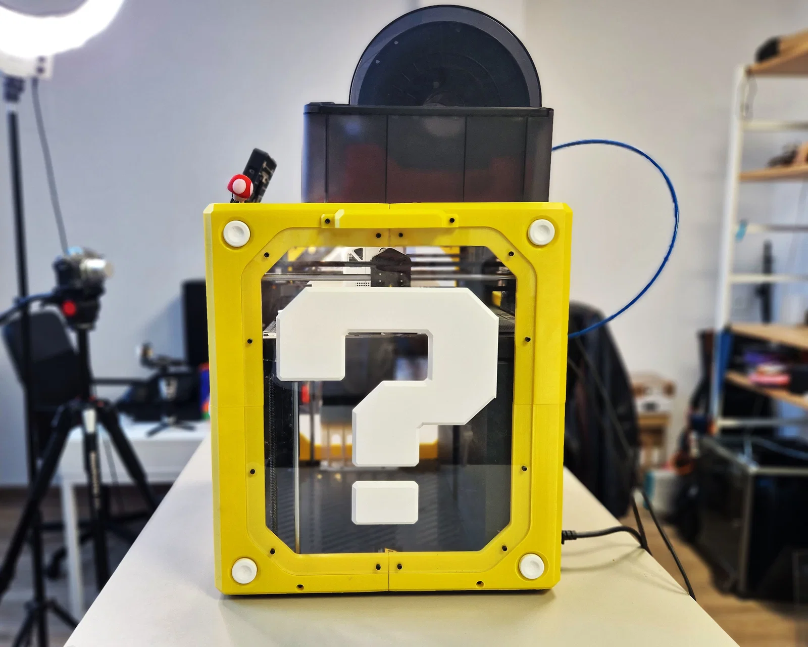 Mod vỏ enclosure khối “?” Super Mario cho Bambu Lab P1P (phiên bản 2.0 Carcasa) được đóng kín hoàn toàn để in vật liệu kỹ thuật. Kèm thông số in cho PETG/PLA và danh sách linh kiện lắp ráp (M3, nam châm, mica DXF).