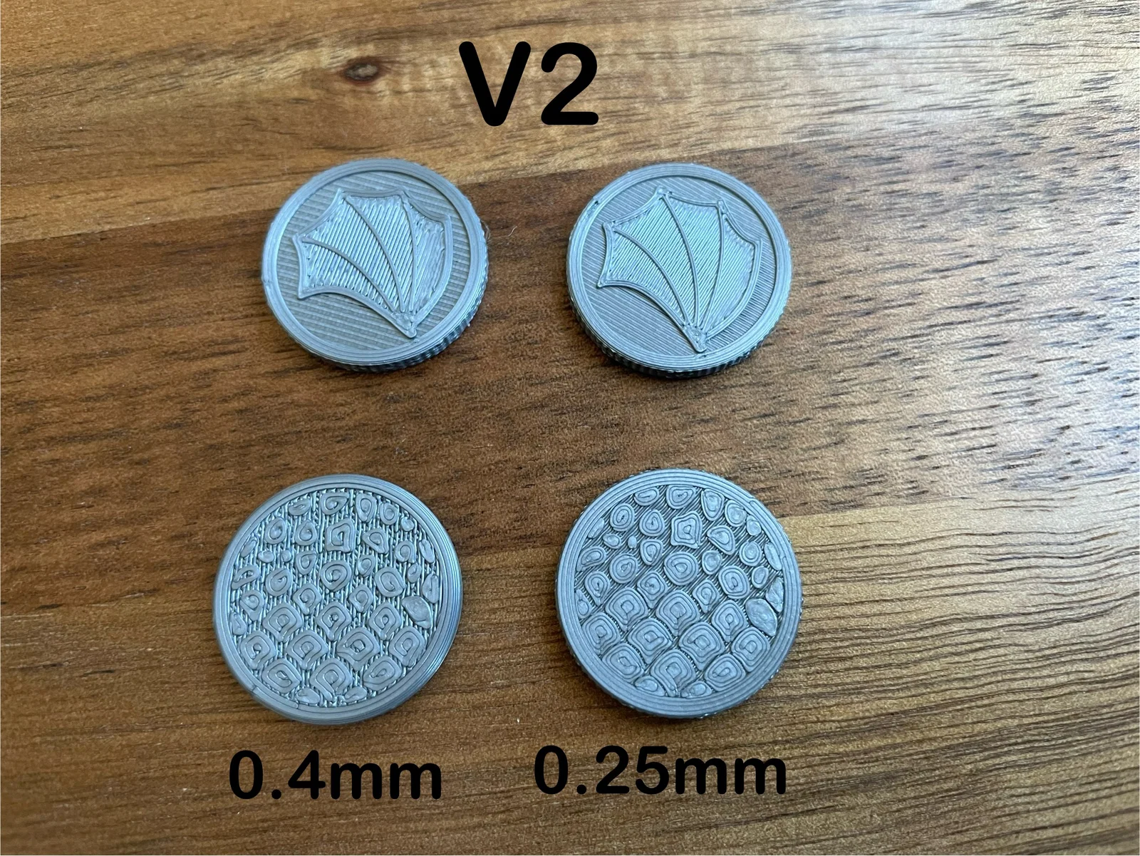 Hiện mình có một model được thiết kế riêng cho đồng 2 cent euro. Đồng này dày hơn đồng US penny một chút nên cần thêm 1 lớp in; vì vậy tổng chiều cao bản in là 3.2mm thay vì 3.05mm như bản US penny. Nó cũng nhỏ hơn về đường kính, nên lỗ sẽ nhỏ hơn chút để giữ fit chặt. Bảng kích thước như sau: