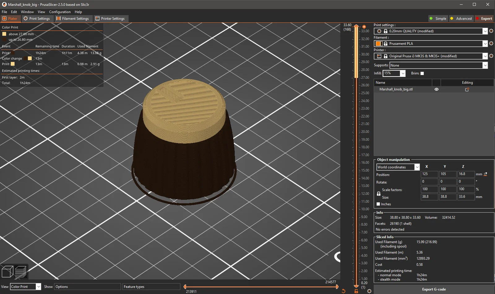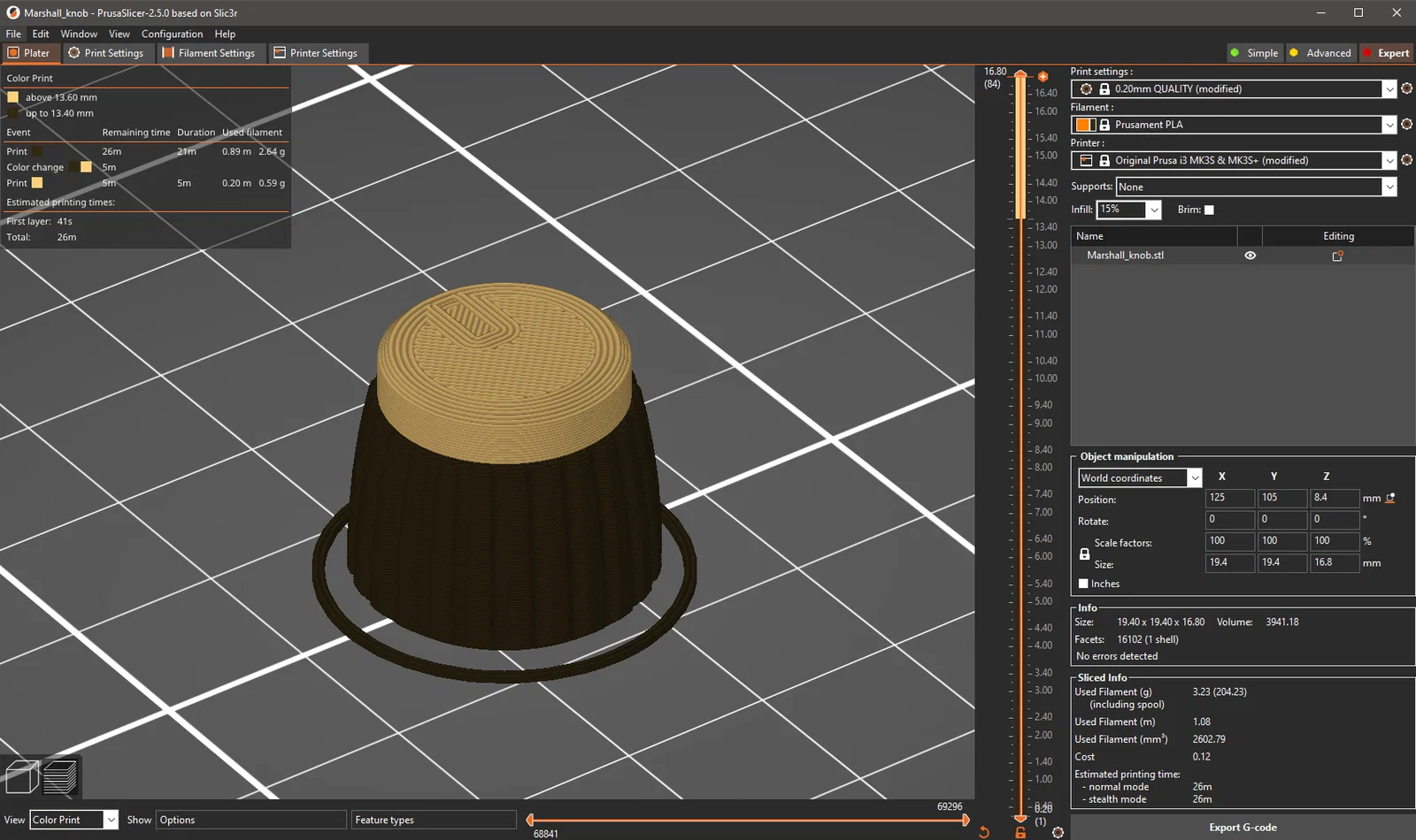 Nếu chọn đúng màu thì nhìn sẽ rất “ngầu”. Ví dụ Galaxy Black (thân) và Viva La Bronze (nắp). Nhân tiện, phần đổi màu trong file 3mf và gcode đã được thiết lập sẵn.