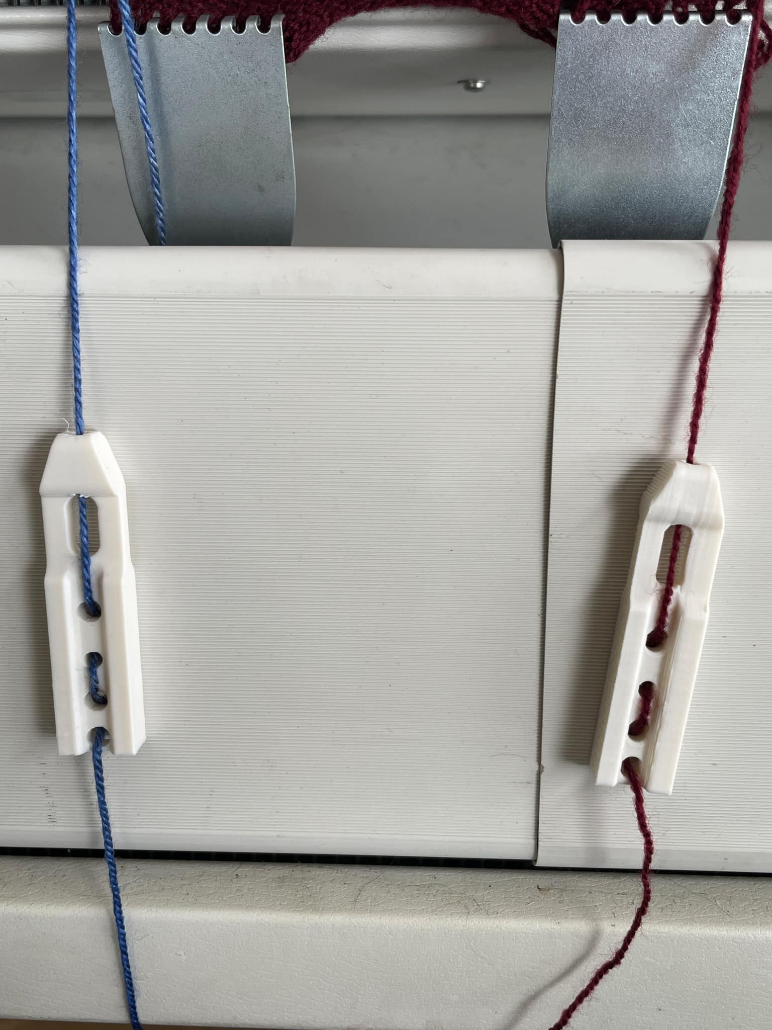 Bộ tạ nhỏ giúp giữ lực căng khi đan intarsia trên máy đan flatbed gia dụng. Cho phép dùng sợi trực tiếp từ yarn cake/cone thay vì quấn bobbin, dễ trượt để chuẩn bị lượt đan kế tiếp.