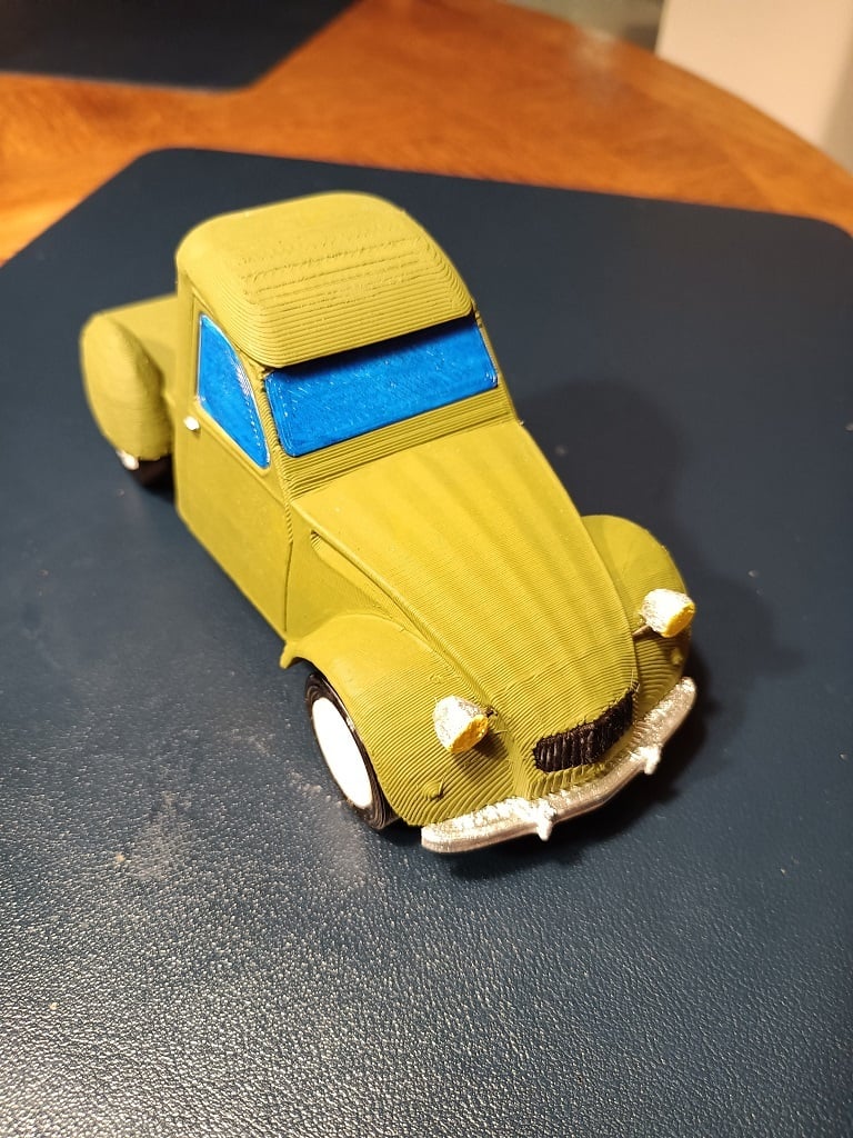 Mẫu Citroen 2CV phong cách “French ATOM”, remix từ nhiều model 2CV. Khuyến nghị thu nhỏ còn 50% để in FDM ổn định. Dùng que xiên làm trục và đèn pha; sơn acrylic cho thân, marker đen/xanh.