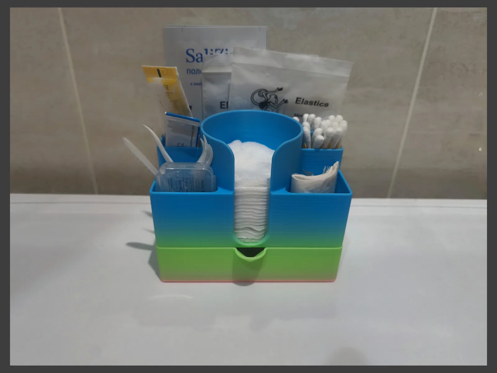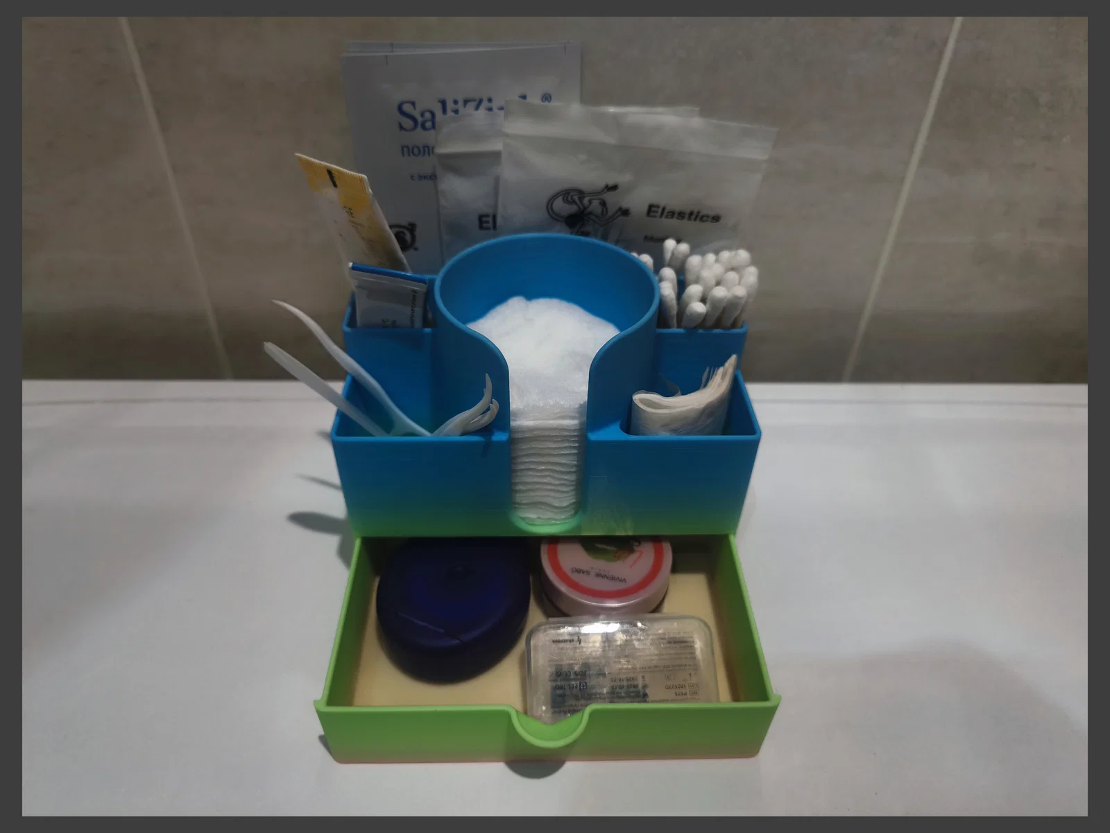 - Đã thêm phiên bản modular để lưu trữ bông tẩy trang, tăm bông và đồ lặt vặt, có ngăn kéo kéo ra để chứa hộp chỉ nha khoa và mini cream. Phía sau còn có một khe để cất mask/khẩu trang dưỡng da và các món khác. Thiết kế vẫn tối giản nhưng sẽ “khó chiều” hơn chút khi in.