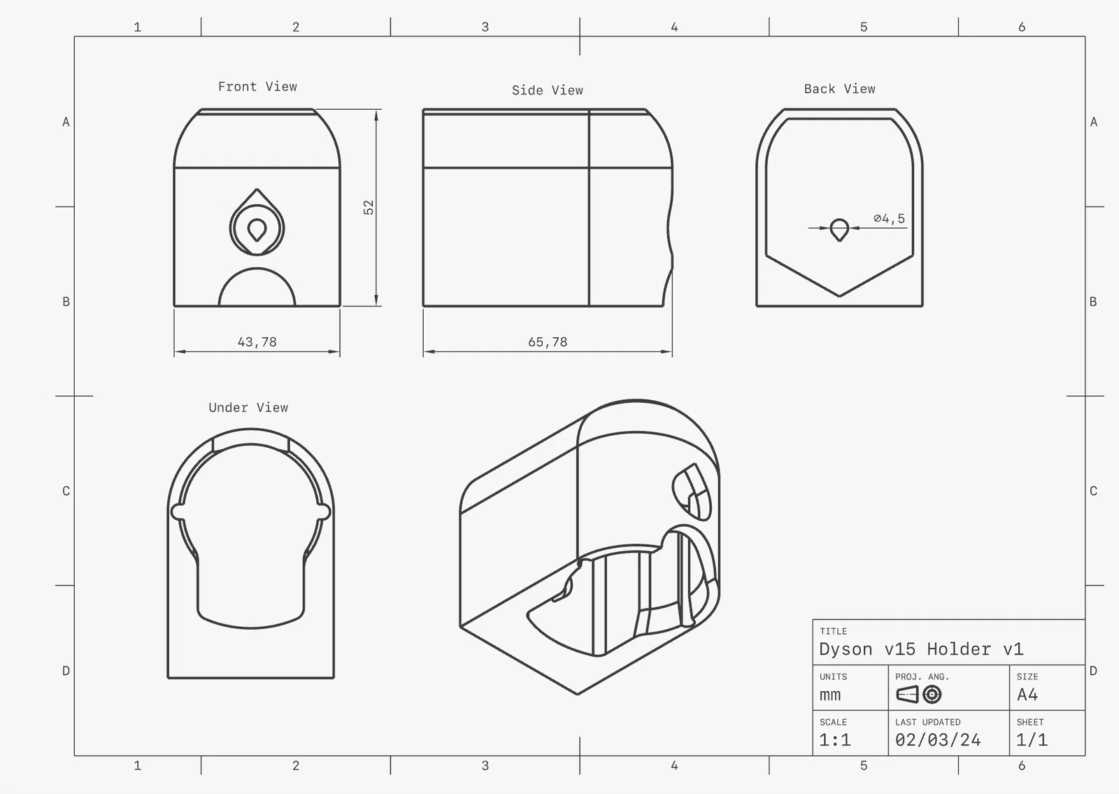 Giá treo Dyson v15 Holder, vừa với hầu hết phụ kiện tiêu chuẩn của Dyson v15. Có thể hợp với các đời cũ hoặc mới hơn nhưng chưa được kiểm tra. Bắt tường bằng 1 con ốc, in PLA 0.2 mm.