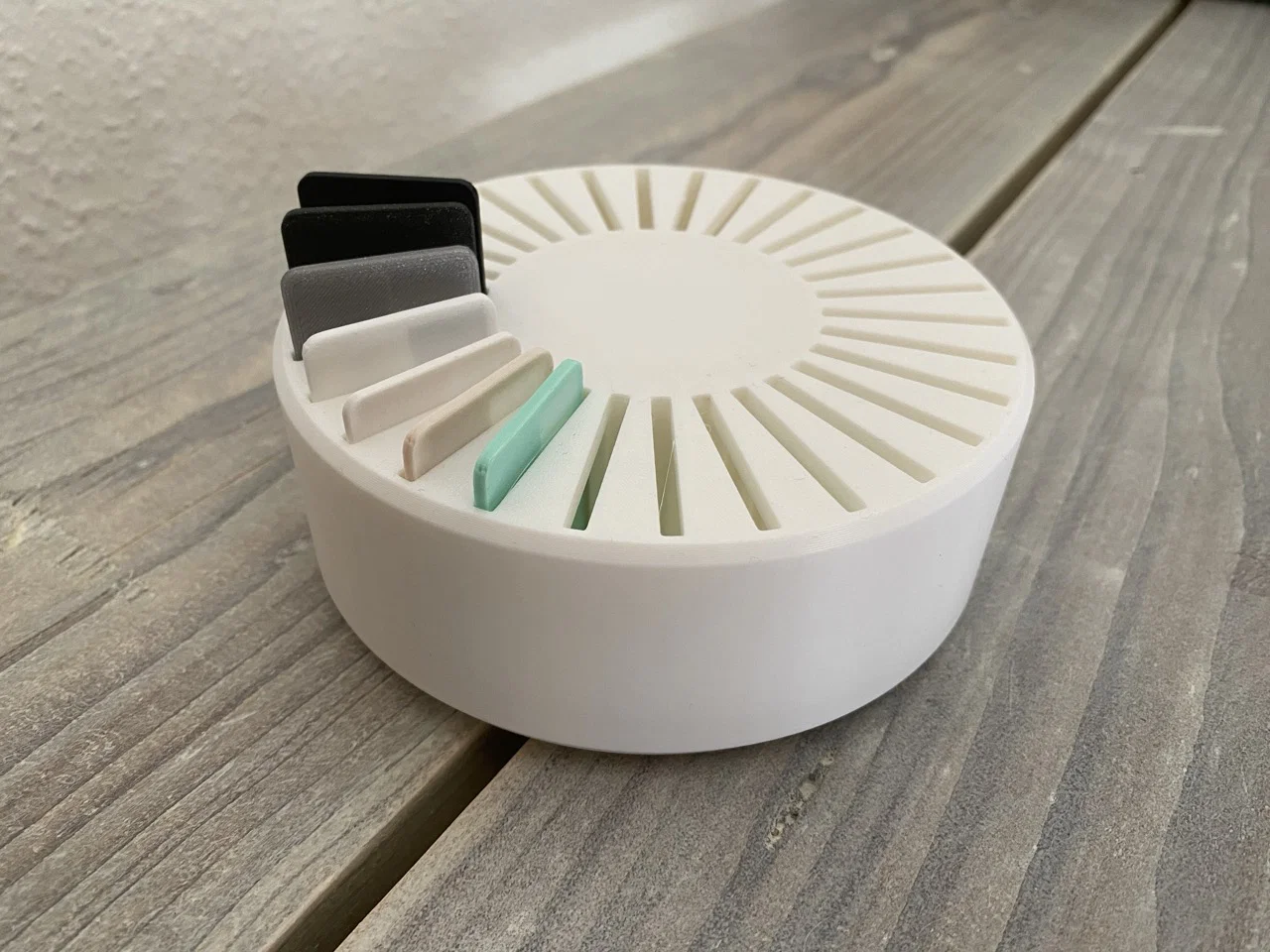 Filament Sample Wheel giúp trưng bày mẫu filament gọn gàng: xoay một cái là từng mẫu tự “trồi” lên để xem màu và texture. Chứa tối đa 30 mẫu, có chỗ dán nhãn 40×12mm, lại còn làm fidget toy để bàn rất đã.