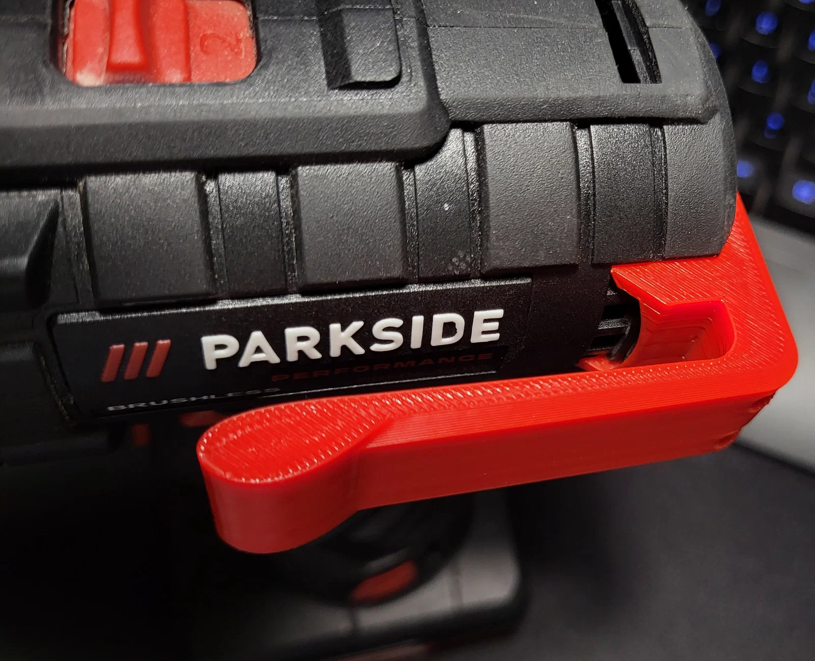 Móc treo dành cho máy khoan Parkside Performance x12V, thay thế badge “Brushless” phía sau để đeo máy khoan lên thắt lưng tiện hơn. In PETG gồm 2 phần, dùng được cho cả tay phải và tay trái.