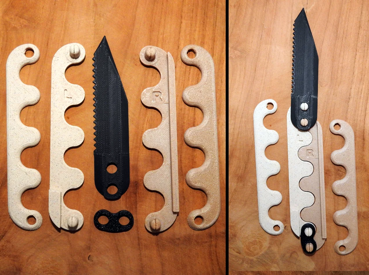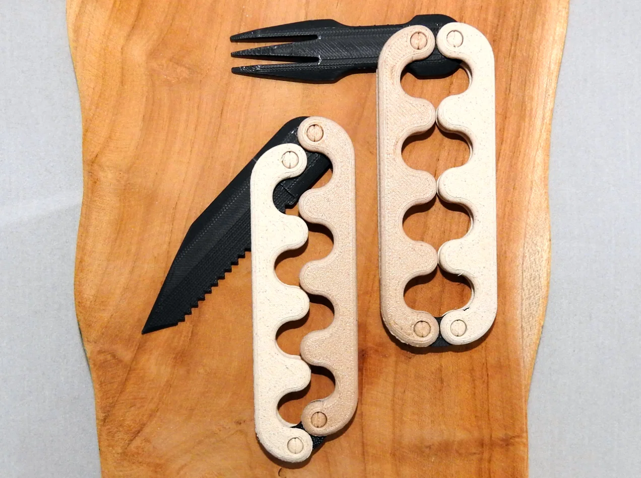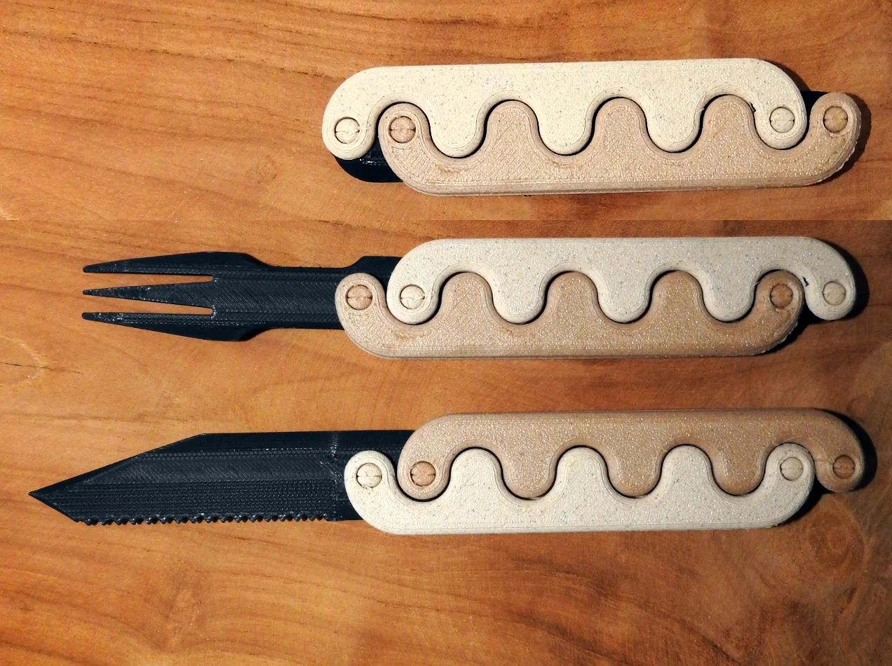 Mẫu Knife and Fork Sidewinder là bộ dao và nĩa gọn nhẹ cho đi camping, picnic và outdoor. Có thể dùng như fidget toy, thao tác hất/trượt để bật ra. In PETG hoặc PLA, không cần support, infill 25%.