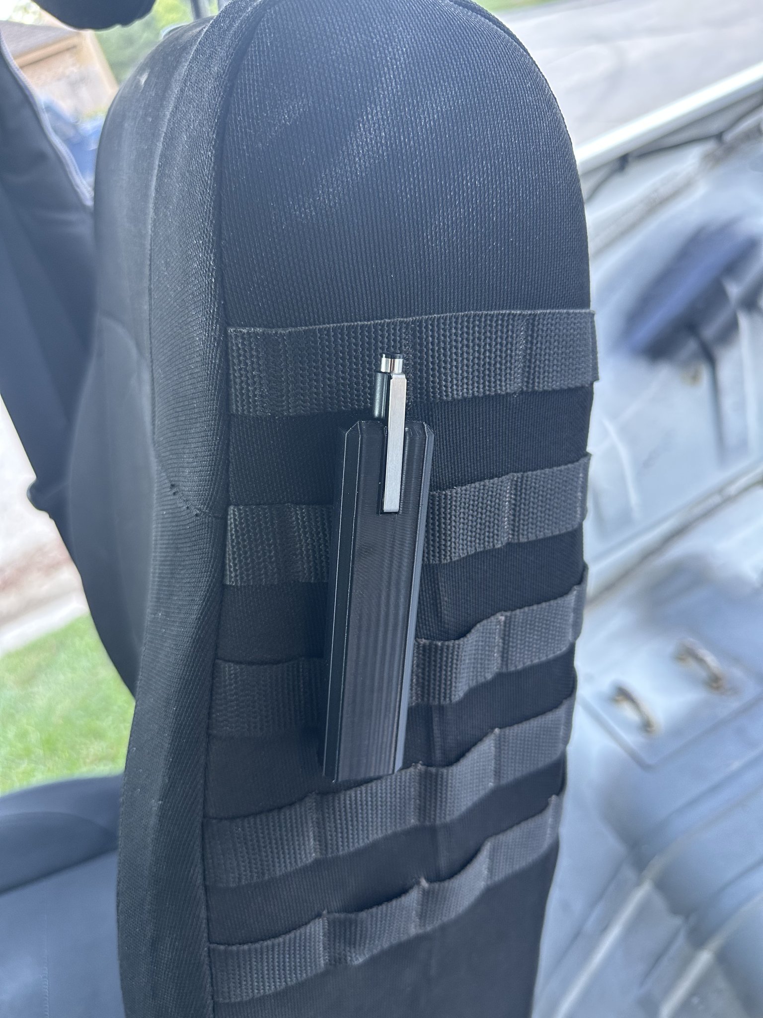 Tôi đã tạo ra cái này để giữ một cây bút sẵn sàng trong chiếc Jeep của mình, chiếc xe có bọc ghế với khả năng PALS (Hệ thống Thang gắn Túi). Tôi cố tình làm cho nó mỏng nhất có thể, để nó có thể hơi lắc lư khi được lắp đặt và chiếm hai thanh trong hệ thống. Hoàn hảo cho mục đích sử dụng của tôi, nhưng có thể quá lỏng lẻo cho việc sử dụng trong công việc trên áo giáp hoặc áo khoác. Nó có một lỗ thoát nước, trong trường hợp bạn bị mắc kẹt dưới mưa mà không có mui.