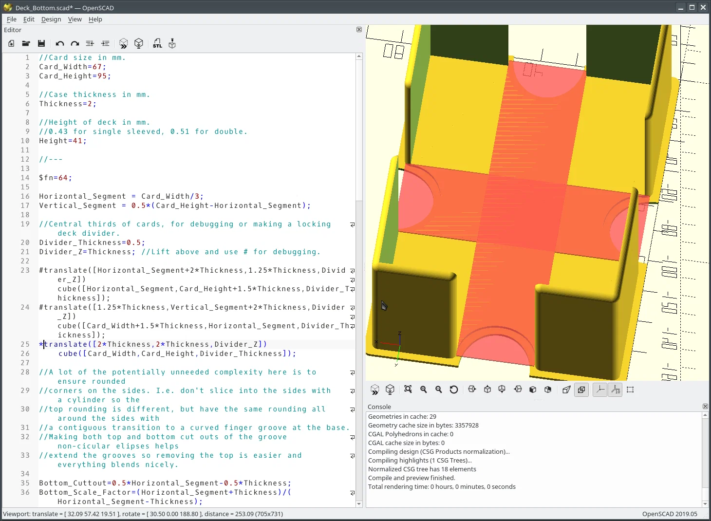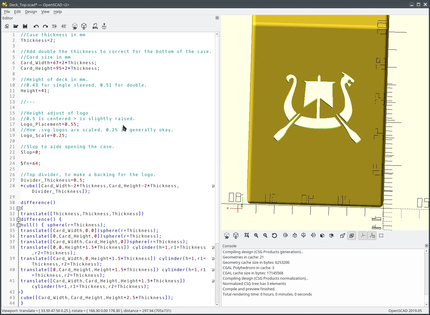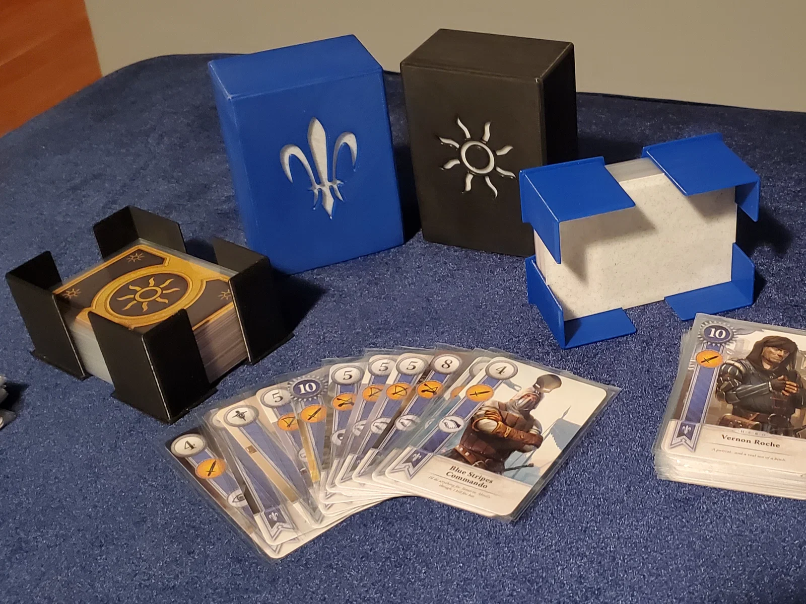 Phần deck holder được thiết kế bằng OpenSCAD và về lý thuyết có thể mở rộng cho bất kỳ CCG nào bằng cách đổi kích thước lá bài và thay (hoặc tắt) phần artwork; chỉ cần đảm bảo kích thước và độ dày lá bài trong cả hai file .scad là giống nhau, nếu không thì chúng sẽ không khớp. Nếu in trên máy có tolerance không tốt và hộp khó mở, có thể cần cộng thêm chút “slop” vào kích thước lá bài cho phần nắp (top). Nếu artwork có phần cutout (như Nilfgaard) thì có thể in riêng top divider rồi dán keo. Mình thấy kiểu đó nhìn đẹp nên mình làm vậy cho tất cả bộ của mình. Lưu ý nhỏ: để dùng SVG, cần OpenSCAD 2019.05 trở lên. Với PLA, mình thấy độ dày 2mm là đủ để chịu rơi từ độ cao mặt bàn (~1m), nhưng rơi cao hơn sẽ làm nứt mép phần nắp và khiến holder bị bung. Chiều cao có thể chỉnh tùy theo kích thước bộ bài mục tiêu và việc dùng sleeve 1 lớp hay double-sleeved.
