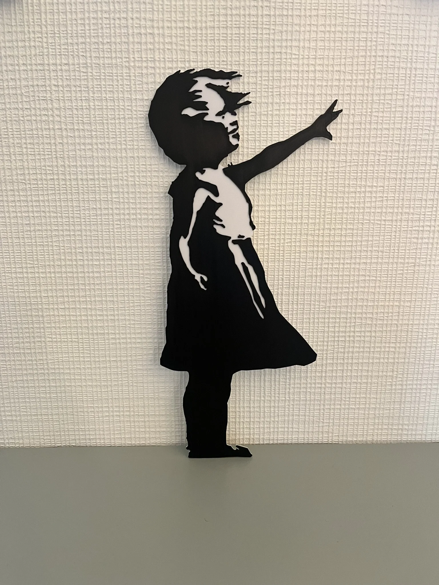 Mẫu Banksy “Girl with a Balloon” để in 2 màu: cô bé trắng/đen, bóng bay đen/đỏ. In lớp màu 1 dày 1 mm (khoảng 5 lớp ở 0,2 mm), rồi đổi filament thủ công để in lớp màu 2 cũng 1 mm. Dán tường bằng băng keo 2 mặt.
