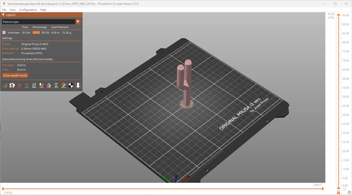 Mình in bằng PETG để tăng độ bền, và cũng nên cân nhắc PETG nếu bạn cất trong nhà kho hoặc để ngoài trời. Mình in layer height 0.20 mm và gần như 100% infill để đảm bảo cứng chắc nhất có thể.