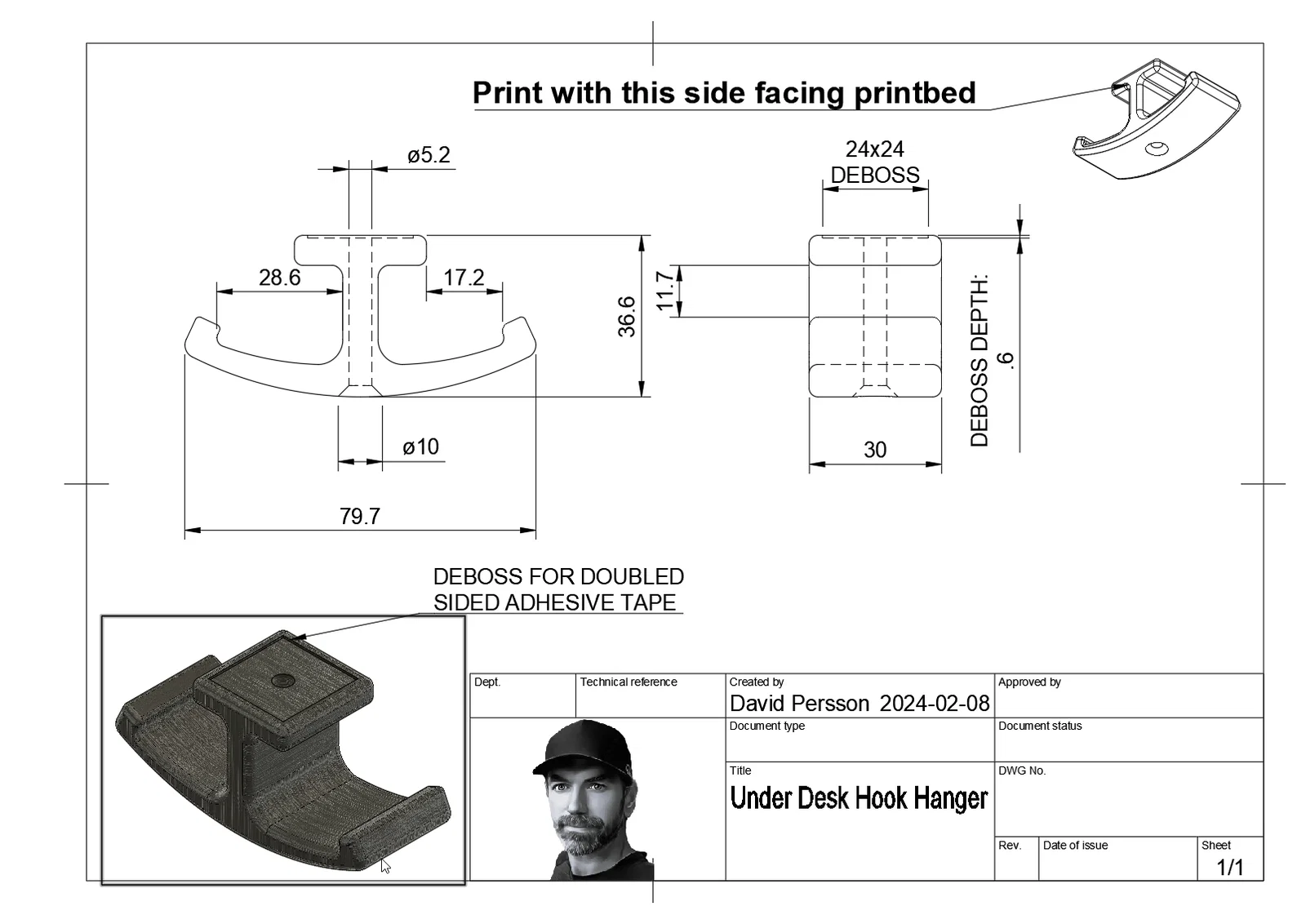 Móc treo đơn giản gắn dưới mặt bàn để treo tai nghe hoặc balo. Có thể bắt ốc hoặc dán bằng băng keo hai mặt. In PLA, không cần supports, infill 15%, đặt mặt phẳng xuống print bed.