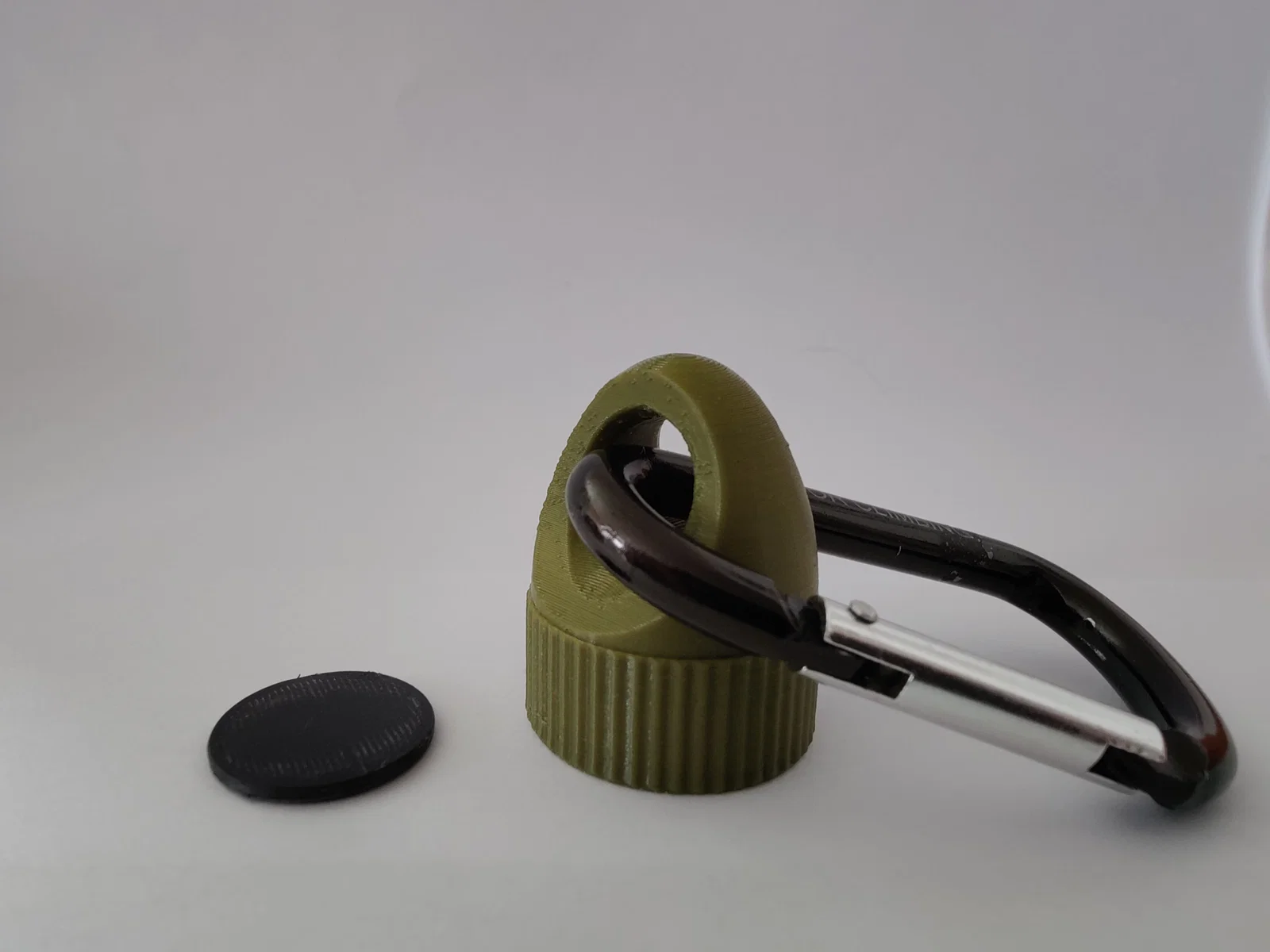 Nắp chai PET đơn giản có vòng carabiner để móc mang theo và gioăng kín chống rò rỉ. Dùng cho chai phổ biến 1,5L và 0,5L. Nắp in PETG, gioăng in TPU; khuyến nghị infill 100% và dùng supports.
