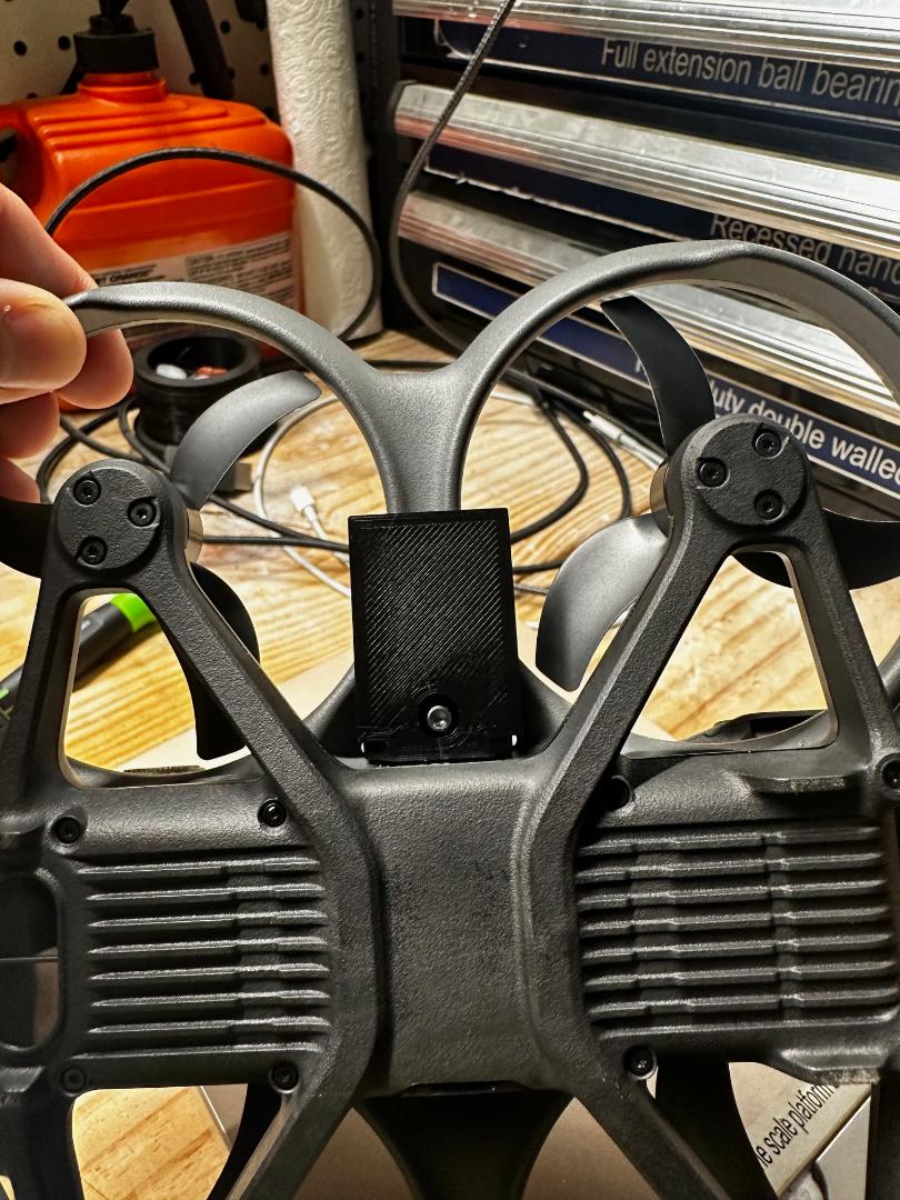 Ngàm gắn đèn cho Avata 2: đèn hướng xuống hỗ trợ visual sensor, cụm đèn trên đặt thấp để không ảnh hưởng turtle mode. Phù hợp đèn LED sạc ~35/25mm, gắn bằng băng keo hai mặt/velcro; bu-lông tự cắt ren. In PLA 210°C, 40% infill.