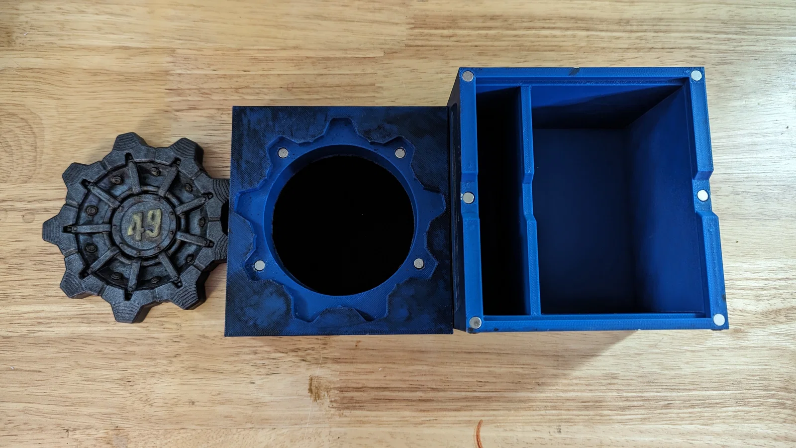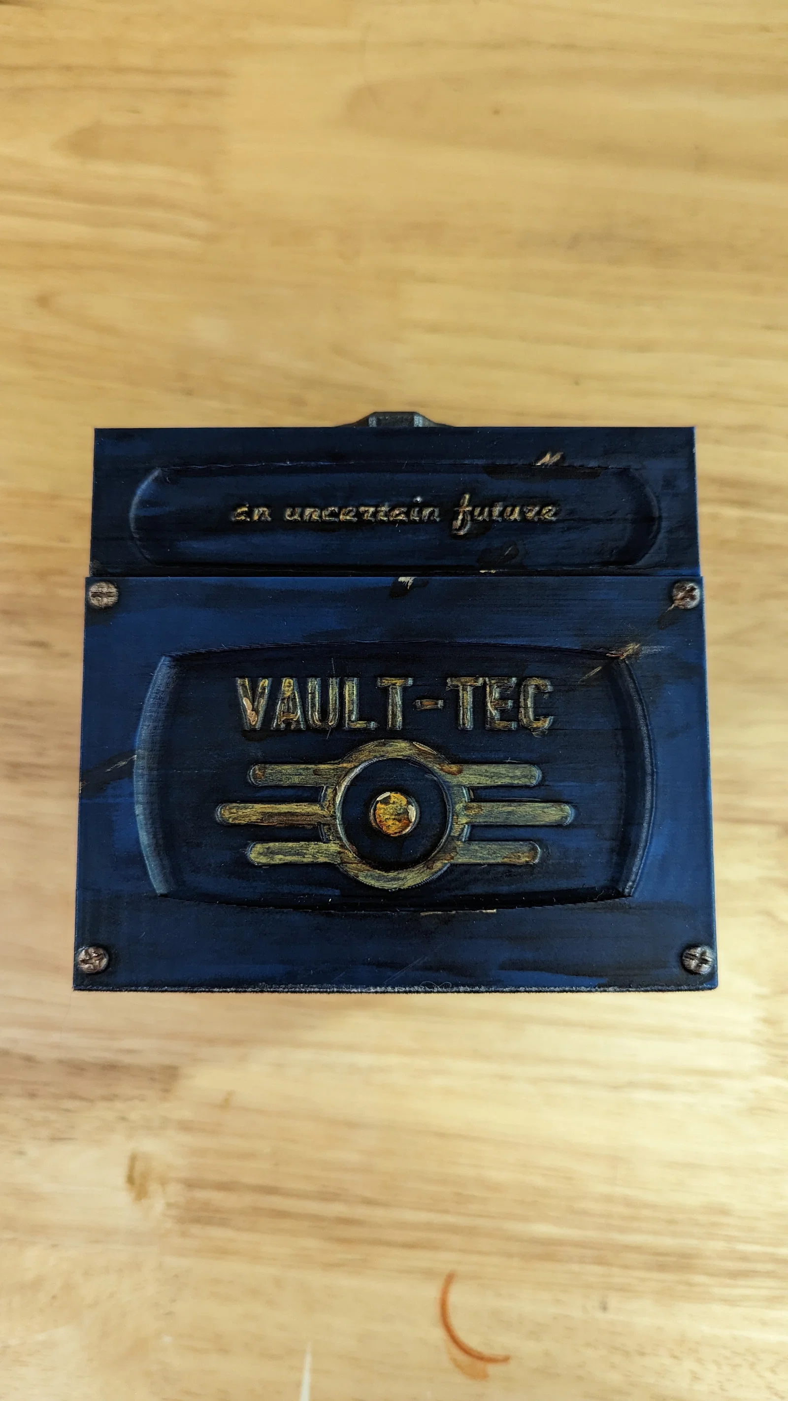 Hộp tiếp tế Vault-Tec lấy cảm hứng từ Fallout, dùng cho bộ Commander của Magic: The Gathering hoặc các game thẻ bài khác. Hộp này dự kiến chứa vừa bộ bài đã bọc sleeve hơi hơn 100 lá ở ngăn chính và token ở ngăn bên. Phần nắp trên sẽ vừa trọn bộ xúc xắc. Dùng nam châm 5mm x 2mm để giữ cửa vault và nắp trên.