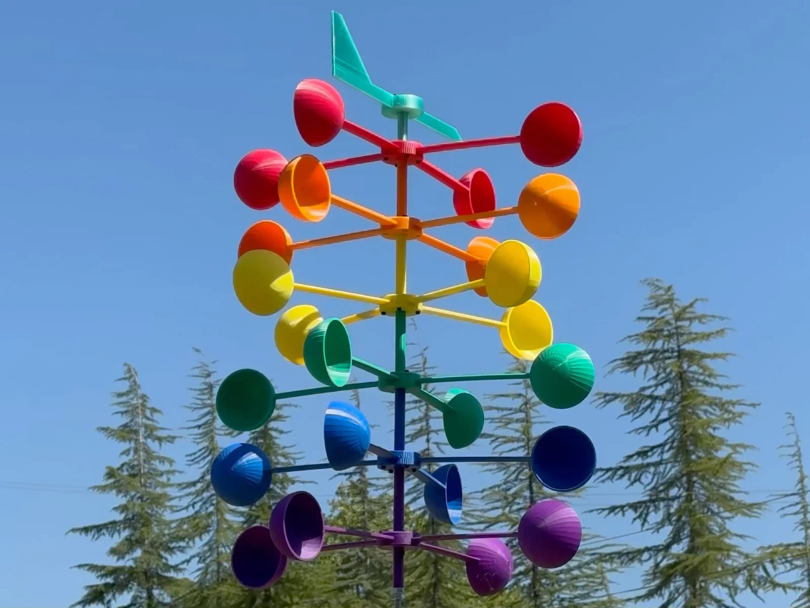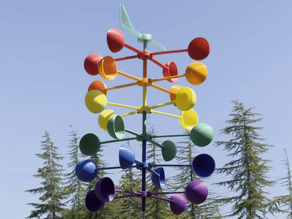 Chong chóng gió cầu vồng dạng modular (bản lớn), muốn in bao nhiêu tầng cũng được, có kèm wind vane. Lắp ty ren M8, dùng vòng bi 608, vít M3x16 và heat set inserts. Khuyến nghị in PETG để chống UV.