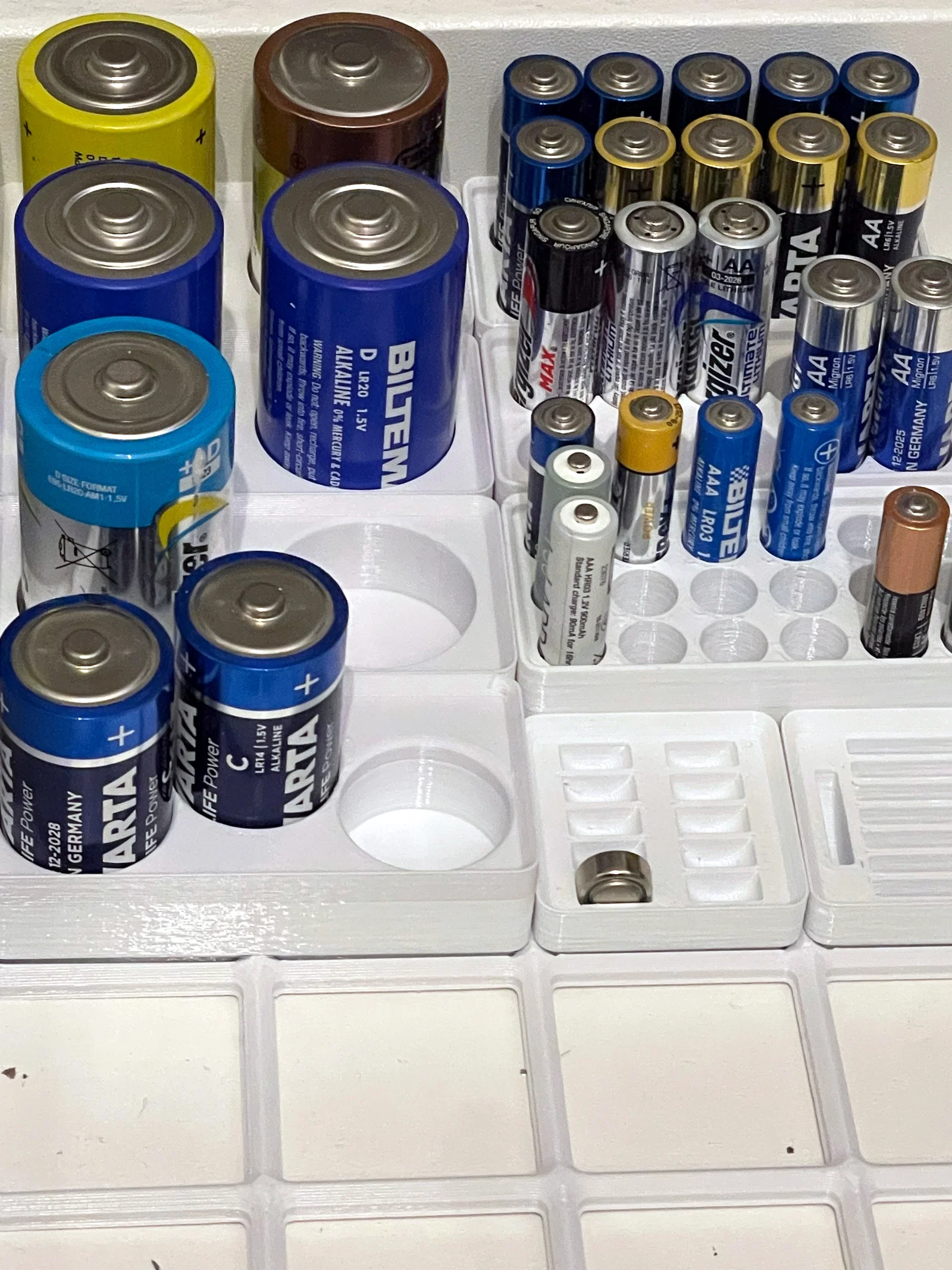 Bộ khay này được tối ưu hóa để chứa được nhiều loại pin phổ biến nhất hiện nay như pin C, pin D, cũng như các loại pin nút áo nhỏ gọn như SR44 hay CR2032. Nhờ cấu trúc module hóa đặc trưng của Gridfinity, bạn có thể dễ dàng lắp ghép, di chuyển hoặc sắp xếp lại các khay chứa này trong tủ hoặc hộp đựng một cách cực kỳ linh hoạt. Điều này không chỉ giúp tiết kiệm diện tích mà còn bảo vệ pin tránh khỏi việc bị đoản mạch do va chạm vào nhau.