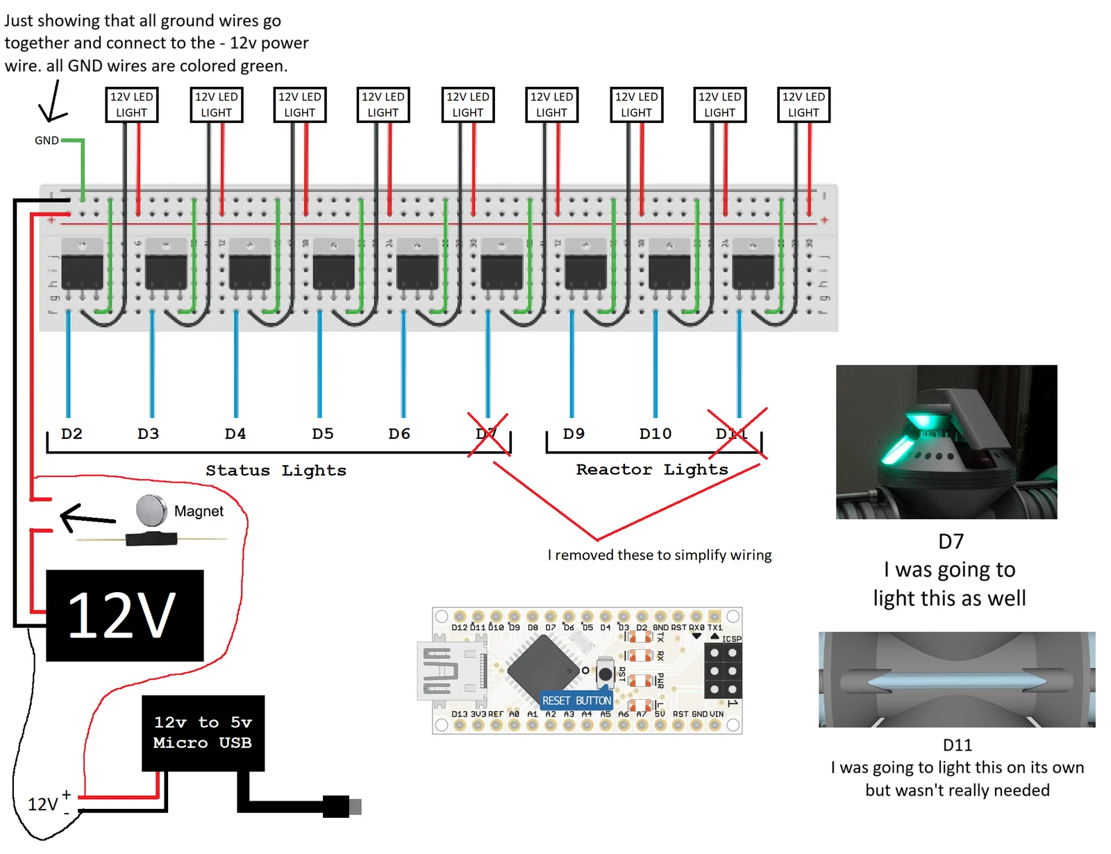 Linh kiện mua thêm: (Danh sách này là những món mình có và đã dùng cho dự án, không cần phải mua đúng từ các link này. Mục đích là để bạn hình dung cần những gì và ước tính chi phí để làm một cái) Magnetic Induction Switch: https://www.amazon.com/gp/product/B07YFBQ4HS Neodymium Disc Magnets, 8 x 3mm: https://www.amazon.com/gp/product/B097HCT43 5mm Blue LED Lights: https://www.amazon.com/gp/product/B07T9LGGJW 5mm White LED Lights: https://www.amazon.com/gp/product/B07T8H6V37 12V LED Strip Light: https://www.amazon.com/gp/product/B00HSF66JO Arduino Nano Every: https://www.amazon.com/gp/product/B07VX7MX27 DC-DC Buck Converter: https://www.amazon.com/gp/product/B08Q34TYV5 N-Channel Power Mosfet: https://www.amazon.com/gp/product/B07CTJFG7M Wire: https://www.amazon.com/gp/product/B009VCZ4V8 DC Power Jack: https://www.amazon.com/gp/product/B01N8VV78D DC Power Jack Adapter: https://www.amazon.com/gp/product/B015OCV5Y8 (Tùy chọn, bạn có thể dùng Cable Port (Blank) và các loại power jack khác ở trên) Super Glue và Epoxy: (để dán/gắn mọi thứ lại với nhau. Mình có dùng epoxy ở vài chỗ muốn độ bám chắc hơn) 3 cuộn nhựa 1KG: (Có thể bạn chỉ cần 2 cuộn, nhưng mình có vài phần phải thiết kế lại LOL) Heat Shrink: nhiều kích cỡ Bộ súng bắn keo nến