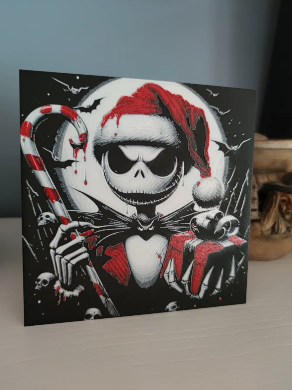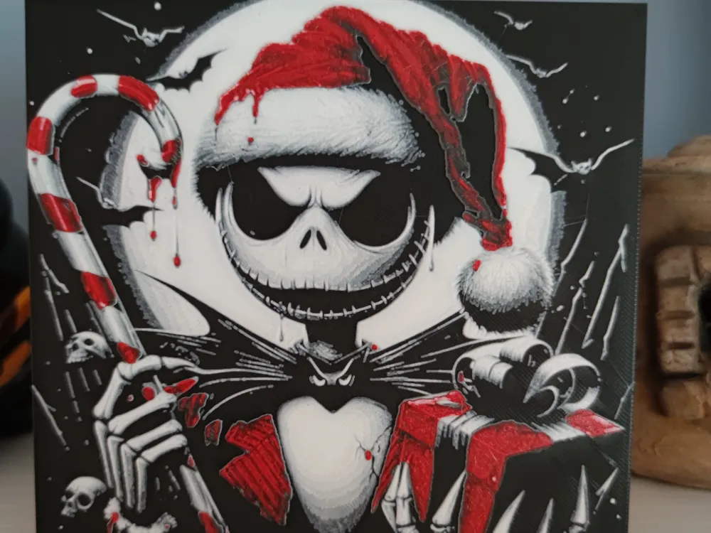 Mẫu Hueforge Jack Skellington dùng kỹ thuật đổi màu theo layer. In 100% infill, layer height 0.08mm, base layer 0.1mm; đổi filament theo các mốc layer để ra đúng hiệu ứng Hueforge.