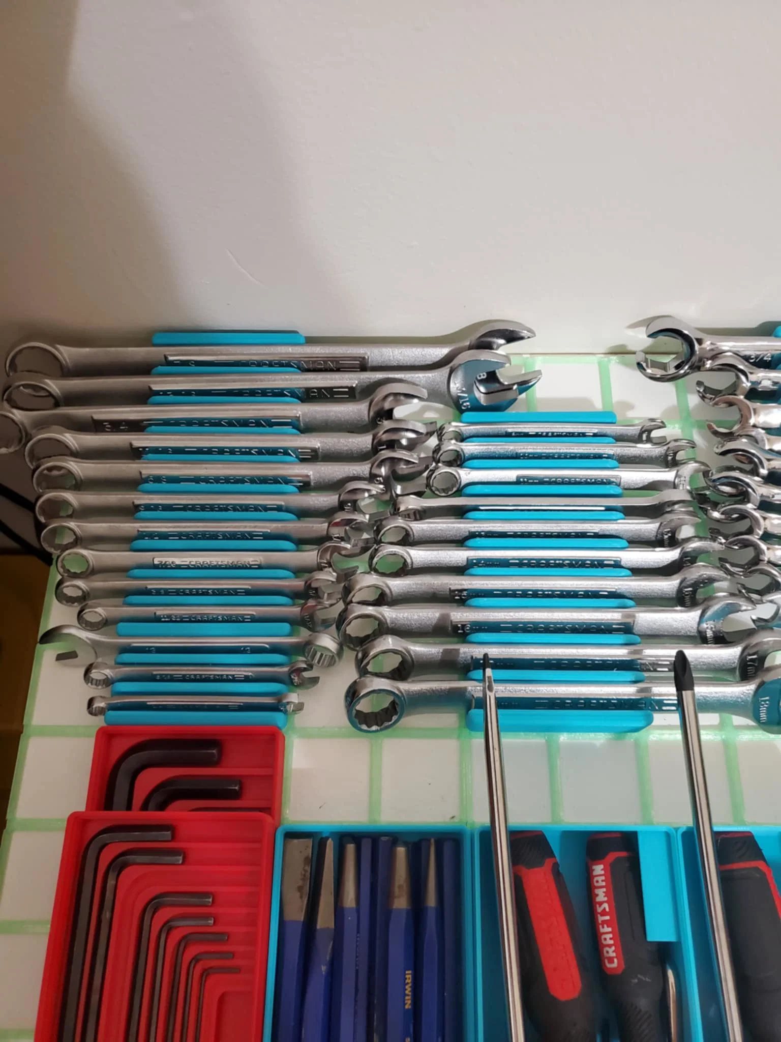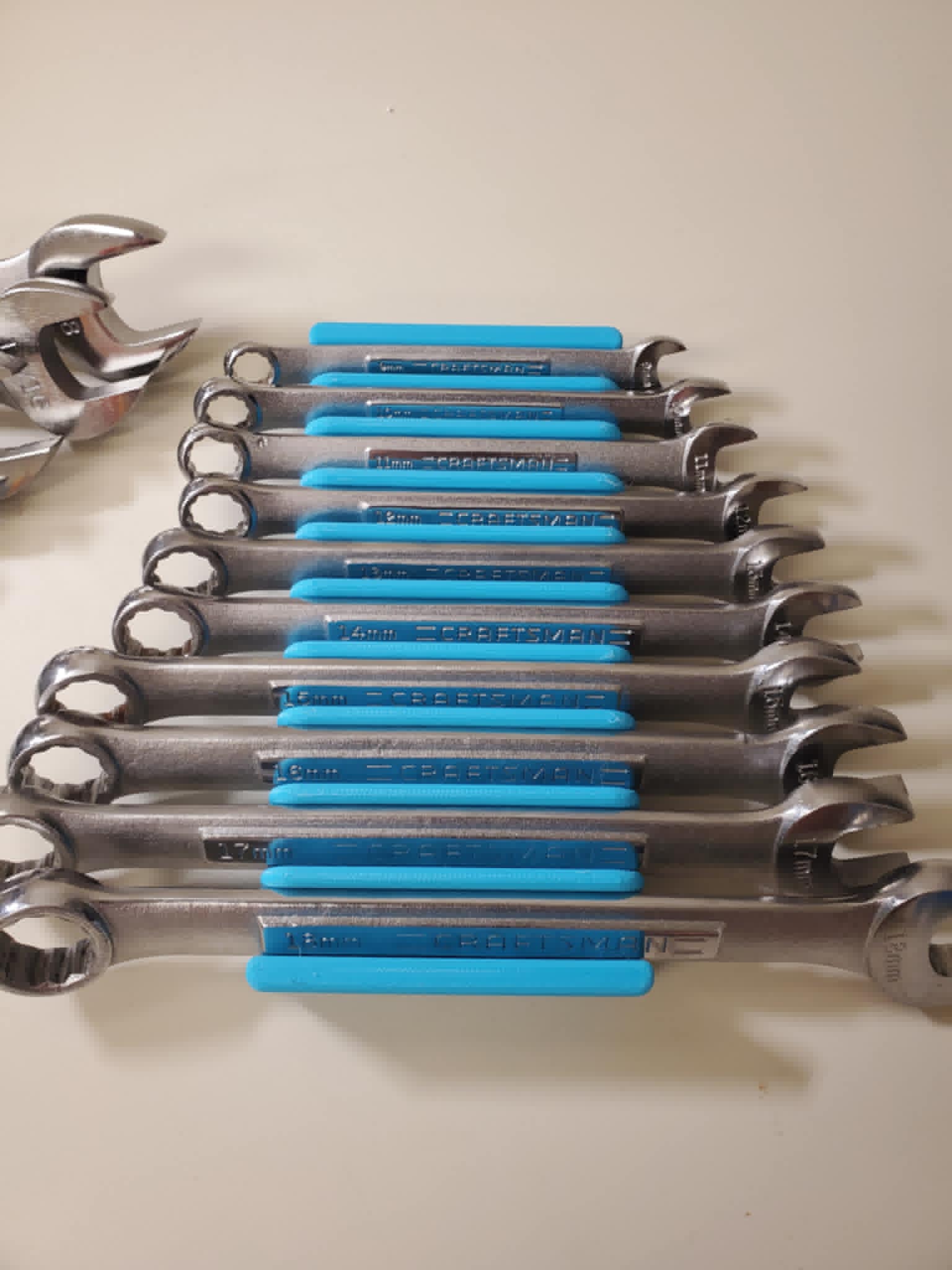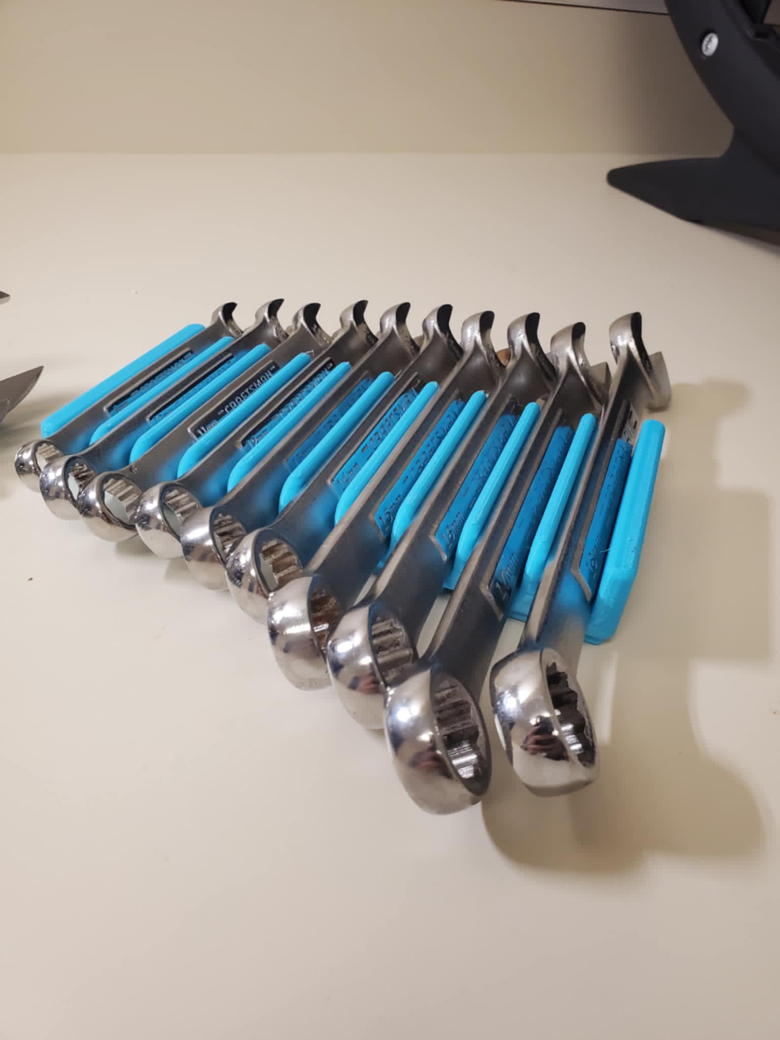 Bản remix từ khay sắp xếp cờ lê 10 món của DesignTheEverything, mình đổi hướng chamfer để cờ lê nằm theo thứ tự từ nhỏ đến lớn thay vì từ lớn đến nhỏ. Nhờ vậy khi cất hai bộ cờ lê, nó có thể đặt sát và đồng bộ hơn với mẫu gốc của DesignTheEverything.