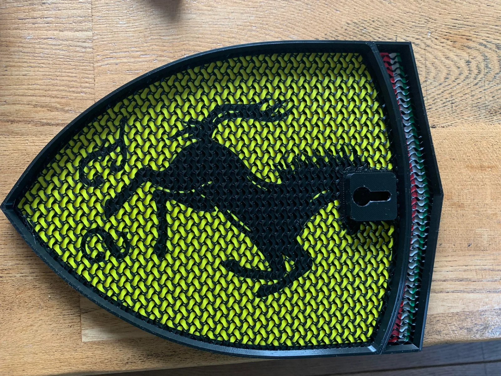 - Ferrari: Logo Ferrari gồm 2 phần và cần dán keo lại với nhau. Mình thiết kế vậy để in được với 1 bộ AMS, vì nhiều bạn không có hơn 1 bộ. Nhớ canh keo đừng tràn ra mặt trước, không là hư logo. Chỉ dùng lượng keo tối thiểu để tránh bị tràn.