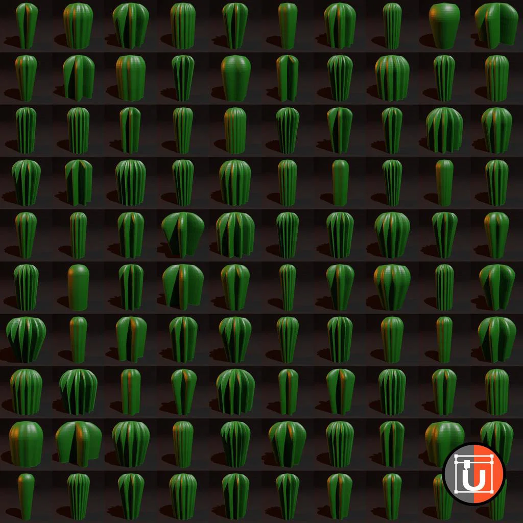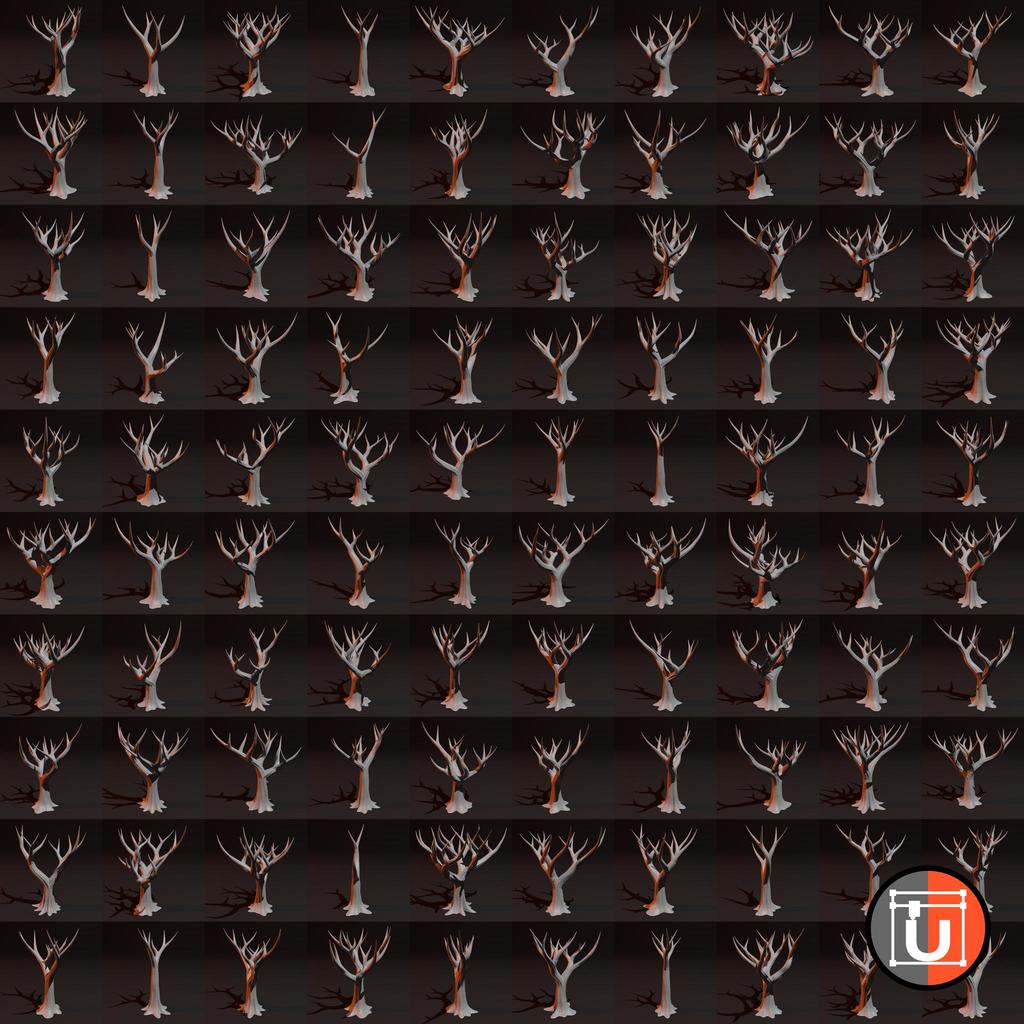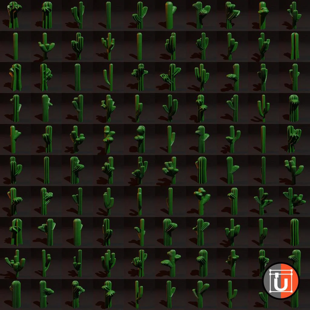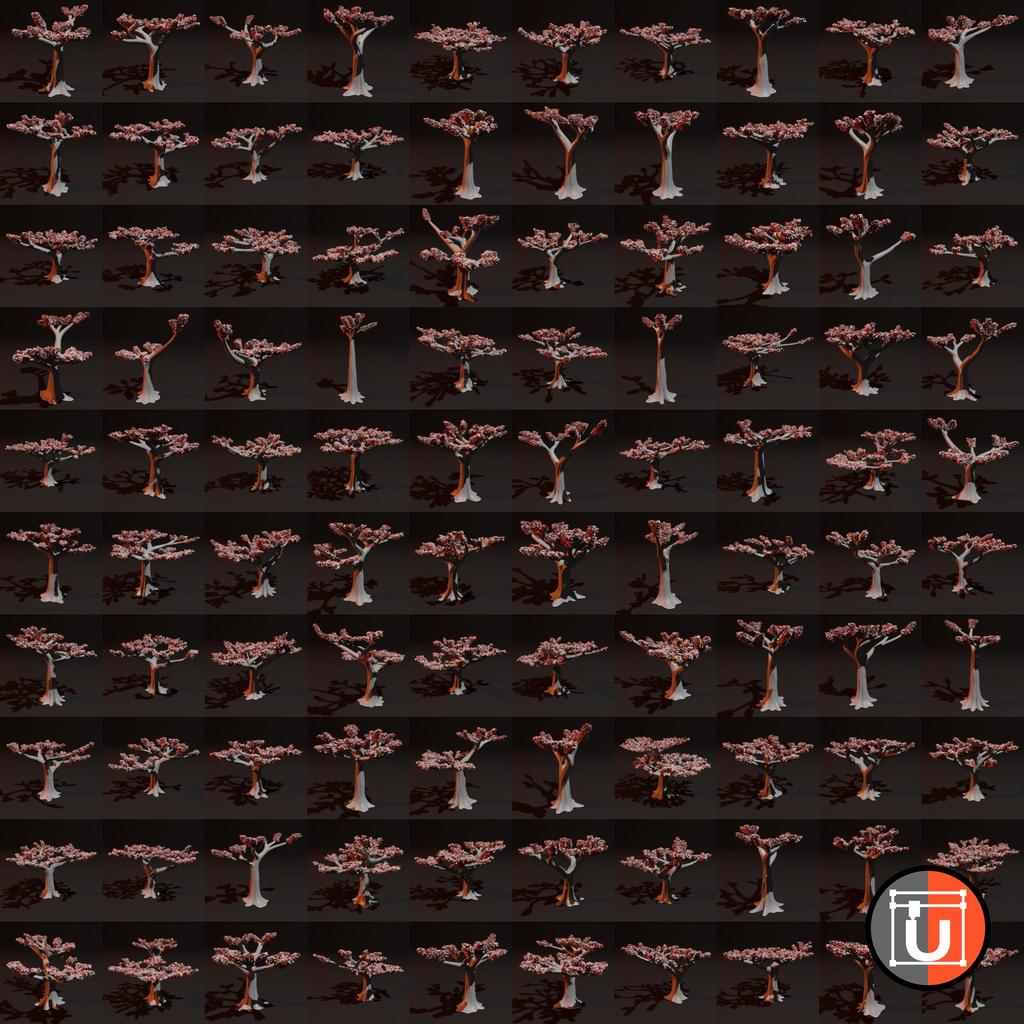 Tree generator giúp bạn tạo nhiều kiểu cây khác nhau và cả xương rồng (đúng settings). Bộ 100 cây có trên Cults do file archive quá lớn. Generator suite + customizer được phát hành qua Patreon.