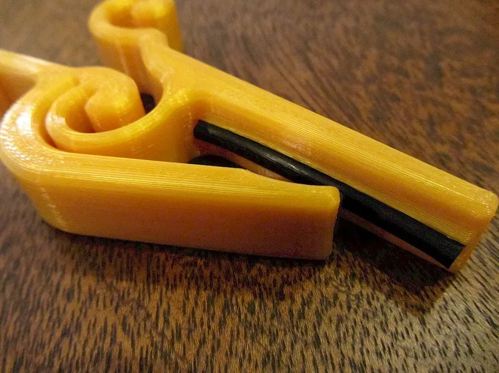 Điều này được in với một kênh tích hợp cho một bộ đệm o-ring. Kênh có một hỗ trợ mỏng, tích hợp mà dễ dàng bóc ra sau khi in. Bạn cũng sẽ cần một đoạn dài ~2" của o-ring dày 3/16" có thể được cắt từ o-ring tiêu chuẩn (http://www.amazon.com/O-Ring-330-BN65-Nitrile-Pack/dp/B000RAI6K4) hoặc có thể được cắt từ dây o-ring. Cắt một đoạn o-ring dài 2.05" và ấn vào kênh trên thanh ép. Cũng là một ý tưởng tốt để đặt một miếng băng dính điện hoặc vải nỉ ở phía dưới của kẹp để bảo vệ cần guitar của bạn.