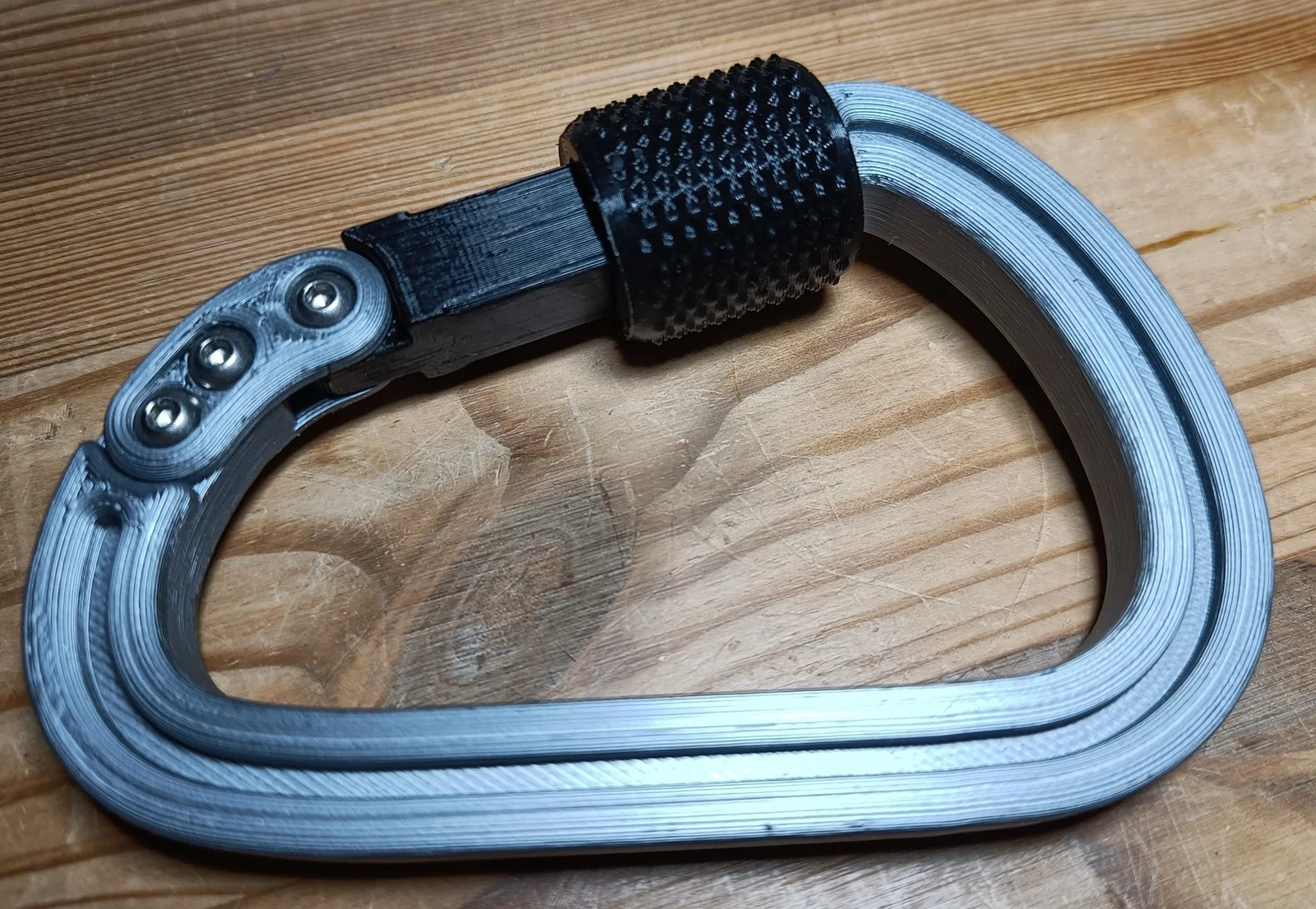 2 phiên bản đầu tiên mình làm carabiner khóa là dùng ốc vặn (screw), nhưng mở/đóng lâu quá. Vì mấy carabiner nhựa này không phải để chịu tải lớn như treo người, nên cơ cấu khóa cũng không cần quá “trâu”. Mẫu này không dành cho tải nặng, nhưng chắc cũng chịu được khoảng 100kg.
