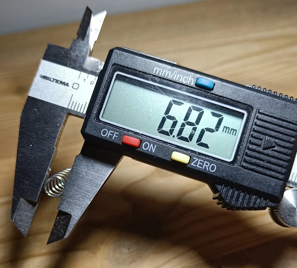 Một cái lò xo Ø7mm x 19mm như trong hình. Lò xo của mình lấy từ một bộ mua từ banggood nhiều năm trước, giờ mình không tìm lại được đơn hàng để xem đúng kích thước. Mình có đính kèm ảnh đo bằng thước cặp (caliper).