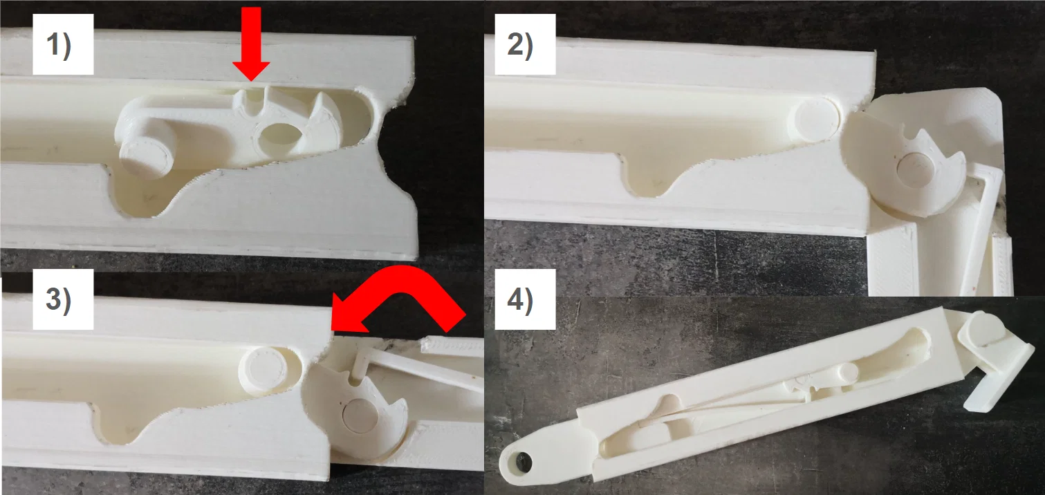 Khi bạn kéo OM-02 thì lò xo đẩy lên OM-03 và ép nó trượt về một phía của rãnh. Sau đó OM-03 bị đẩy vào một khe, khiến cơ cấu bị khóa không thể đóng lại. Khi bạn mở thêm một chút nữa, lò xo sẽ gài vào phần cut-out của OM-03 và giữ ở vị trí mở cho tới khi toàn bộ cơ cấu được đóng hoàn toàn. Lúc đó lò xo bật ra khỏi cut-out và lại đẩy lên OM-03.