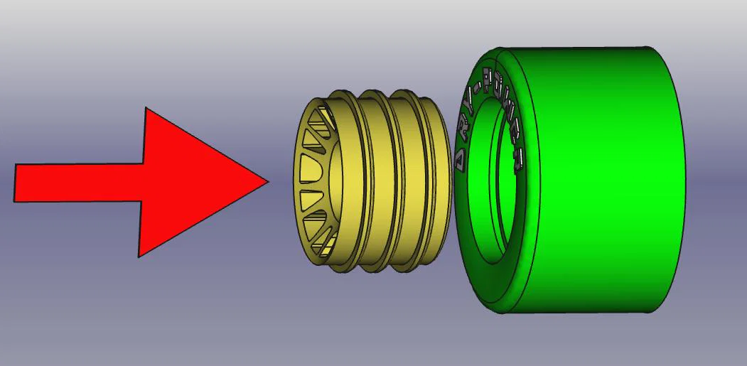 Hâm nóng phần lốp (phần ngoài) khá lâu (mình đoán ít nhất 1 tiếng, do dẫn nhiệt kém) ở khoảng 90°C cho nóng đều. Thoa một ít xà phòng (nước rửa chén) lên mâm cũng giúp ích. Khi ép vào thì vừa cần lực lớn, vừa cần ép thẳng (theo trục/axial). (Ví dụ dùng máy khoan bàn KHÔNG quay.) Mình cũng bổ sung file một “core” để kẹp vào máy khoan bàn nhằm ép cho chuẩn. Vặn một con ốc lục giác chìm M6 kèm long đền lớn vào phần ren, kẹp đầu ốc vào đầu kẹp mũi khoan (drill chuck), rồi sau khi hâm nóng lốp thì ép vào theo phương “AXIAL”.