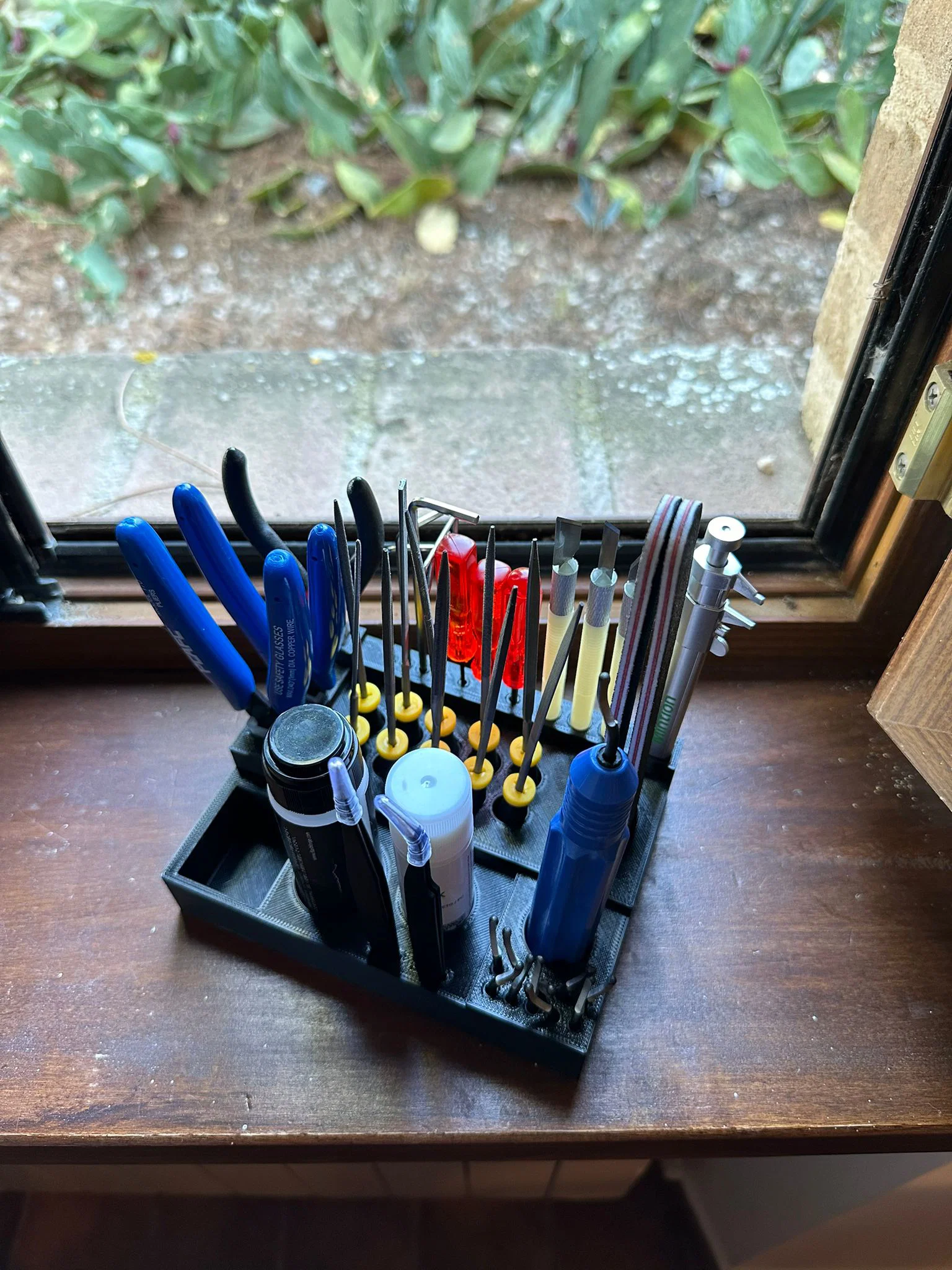 - Sắp xếp khoa học: Phân loại linh hoạt với nhiều kích cỡ lỗ cắm khác nhau, giúp giữ đứng các loại tua vít và dũa mà không lo bị đổ.