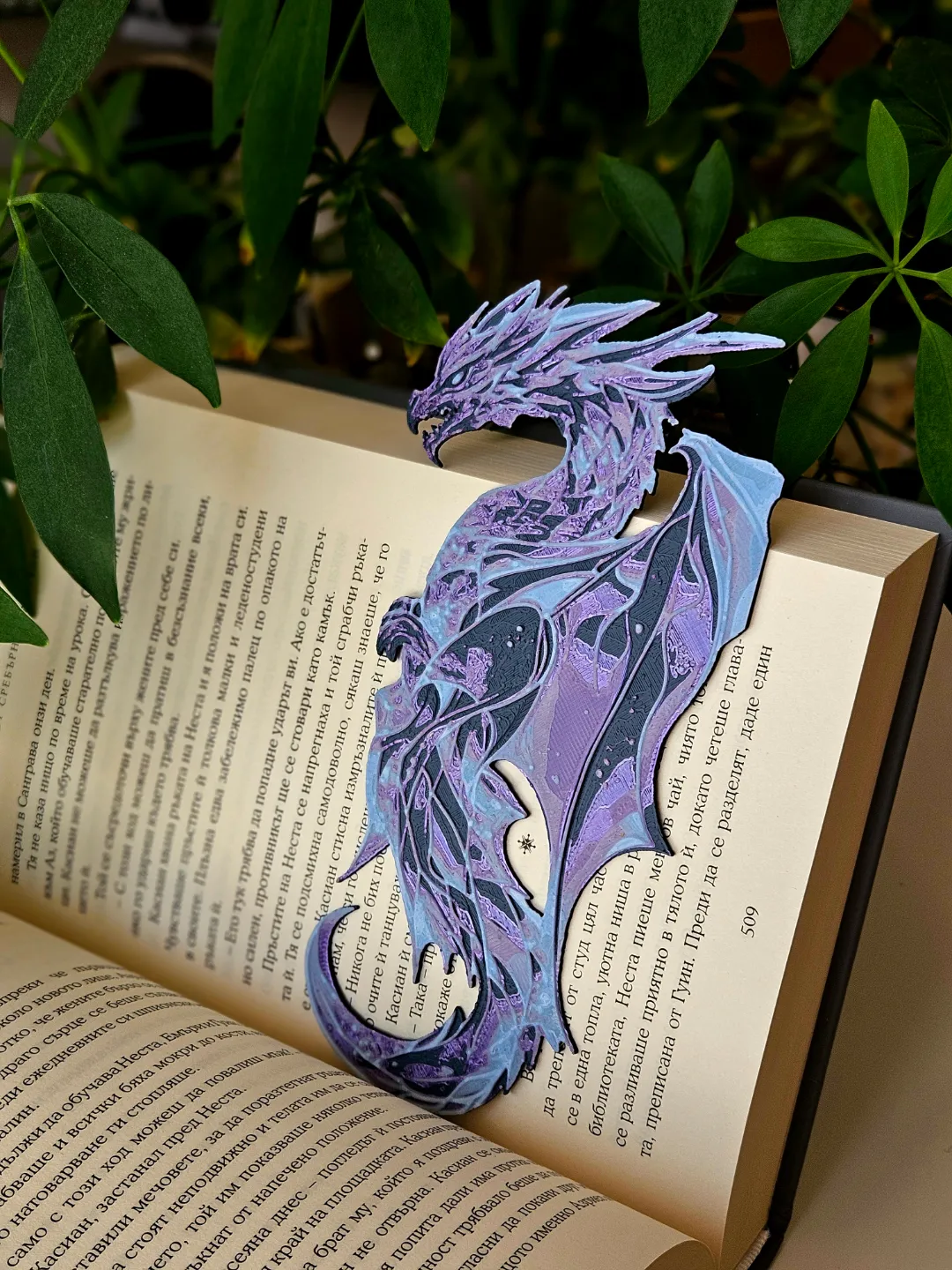 Crystal Wyvern - Dragon Bookmark là mẫu bookmark rồng wyvern phủ tinh thể, vảy sắc nét ánh tím đậm và xanh băng. In đẹp với nozzle 0.2 (0.4 cũng ổn), đổi màu theo layer để tiết kiệm filament.