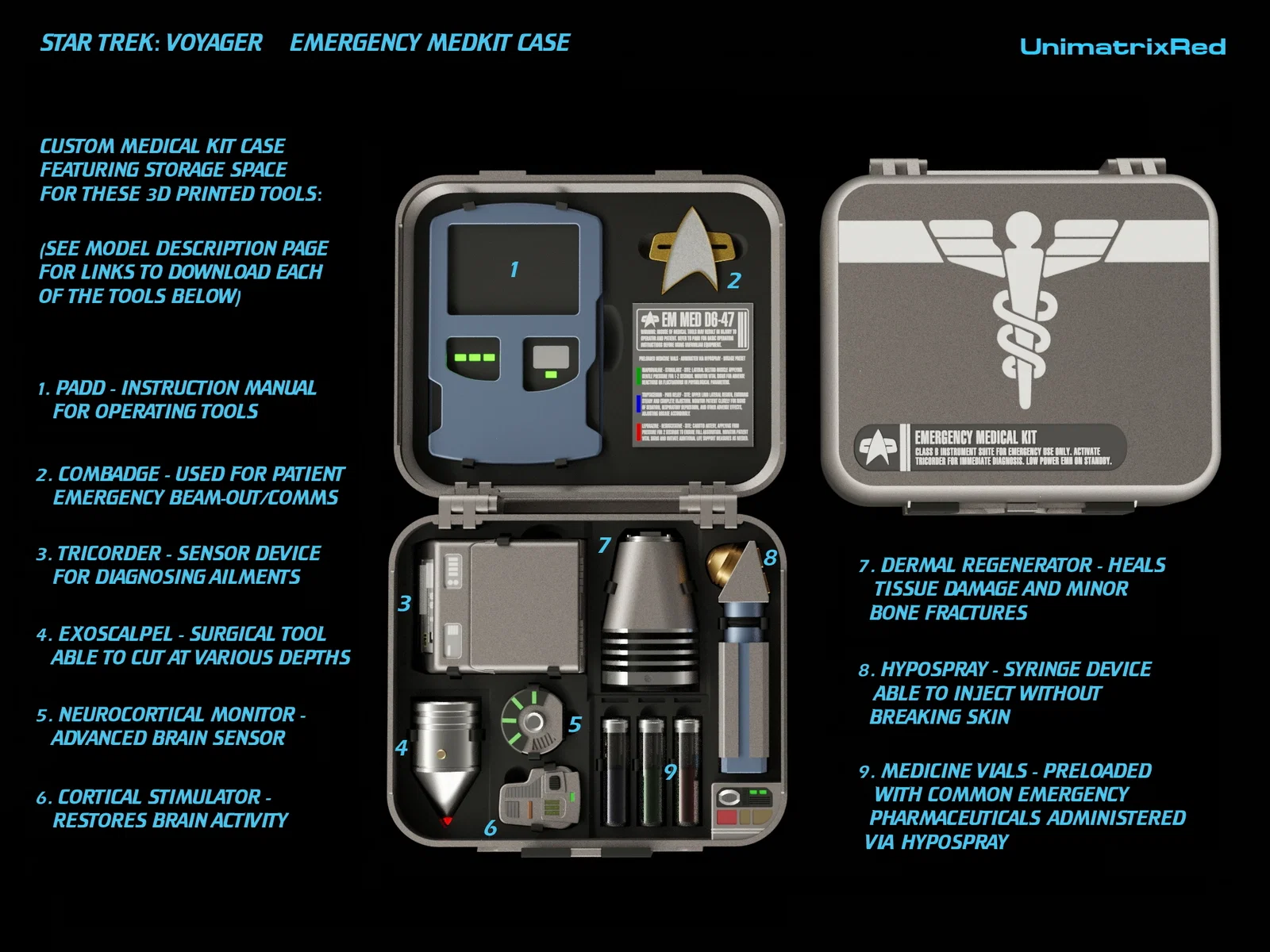 Tự làm hộp medkit phong cách Starfleet để đựng nhiều đạo cụ y tế 3D print, tiện mang đi cosplay. Thiết kế có khay, nắp/tay xách nhiều lựa chọn, dùng nam châm 6x2mm cho lẫy và combadge.