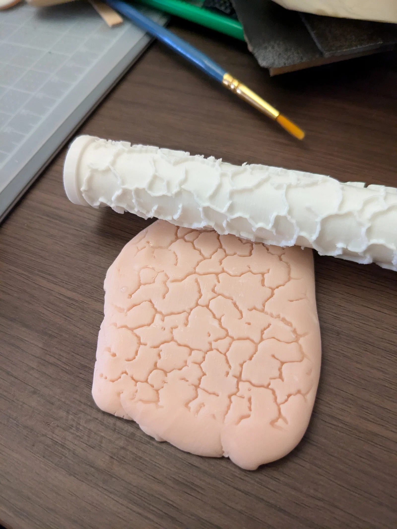 Cây lăn tạo texture cho đất sét và epoxy, giúp in họa tiết mặt đất nứt nẻ kiểu sa mạc hoặc nhựa đường nứt đô thị. Phù hợp làm base cho mini; có thể luồn que làm tay cầm và làm ướt để chống dính.