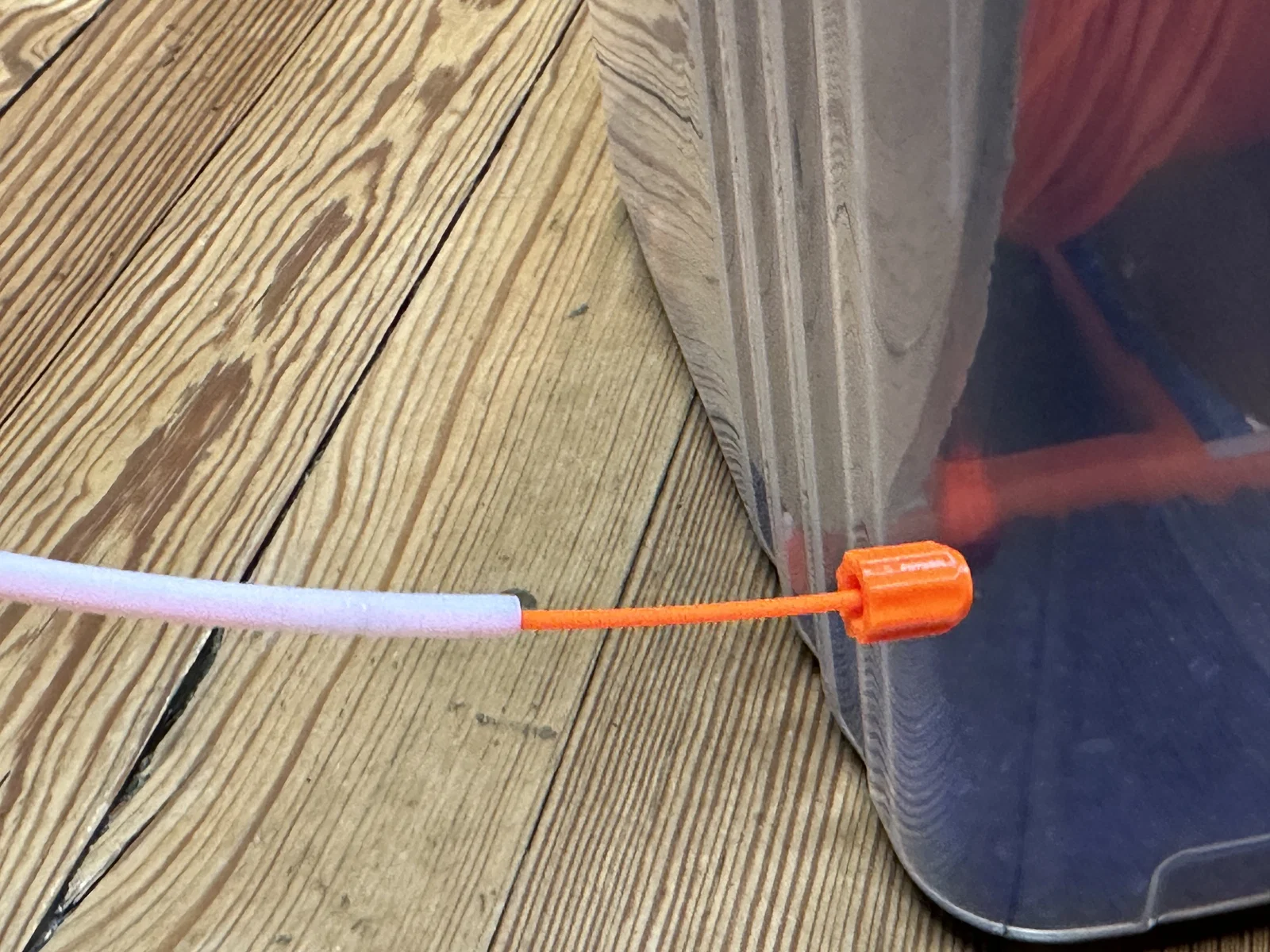 Nắp bịt đầu ống PTFE 4mm nhưng vẫn kẹp giữ sợi filament 1.75mm bên trong, rất tiện cho drybox. In nhanh, không cần supports; dùng 0.2mm layer với nozzle 0.4mm và setting mặc định là ổn.