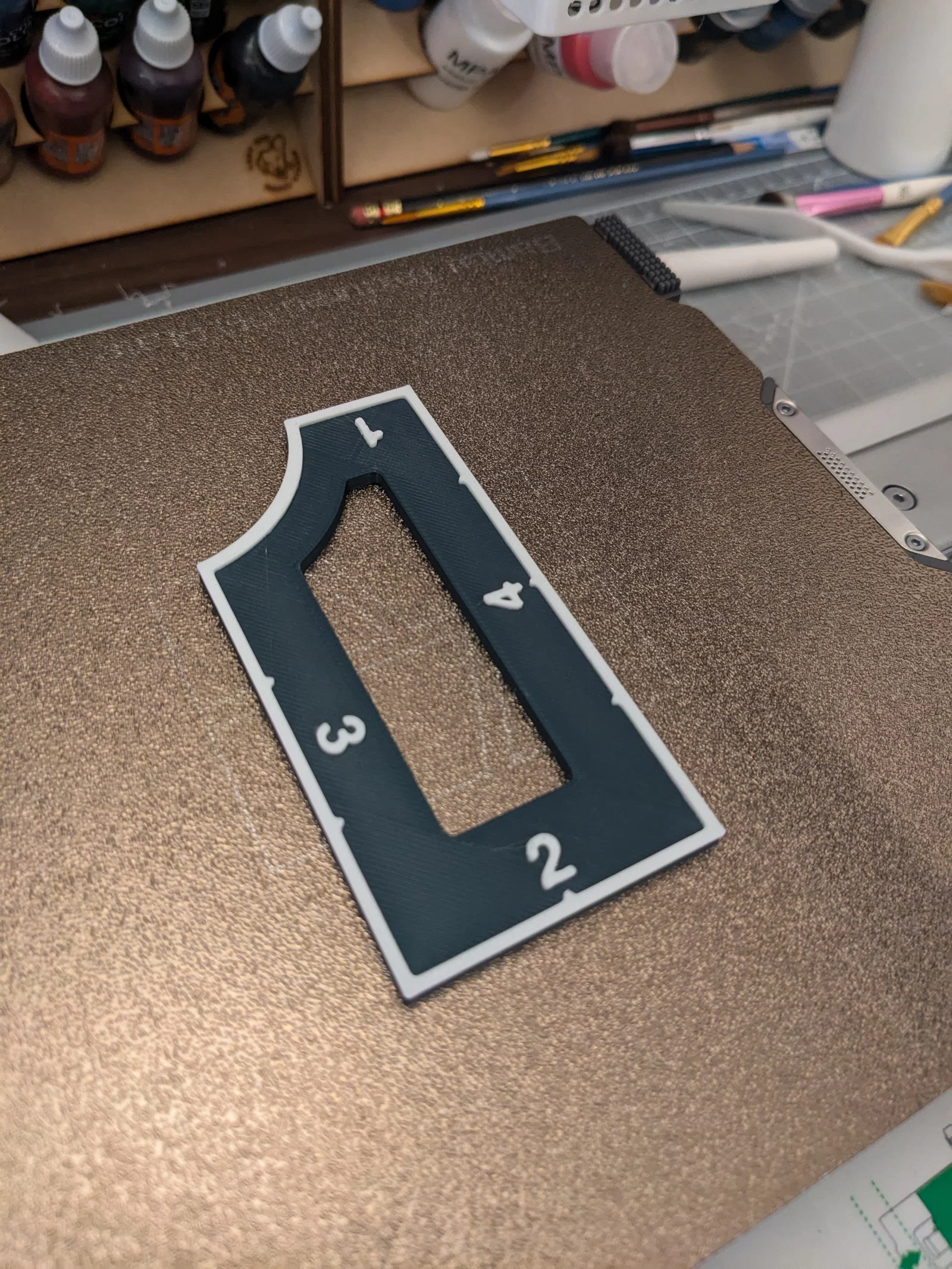 Có kèm 2 phiên bản: một bản có khoét rỗng ở giữa để giảm trọng lượng và tiết kiệm filament, và một bản không khoét. Mình có thêm lệnh pause trong slicer để tự đổi màu ở layer đầu tiên chỗ hiện các con số. Cách này giúp số và viền nổi bật hơn hẳn.